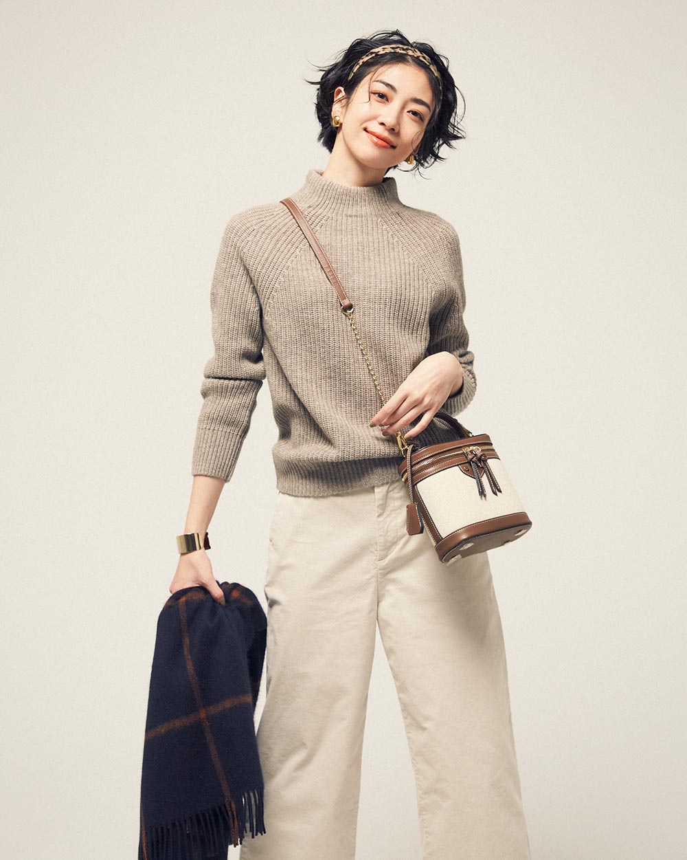 優しい色だから、レオパードカチューシャなどの遊びも受け止めてくれる。ニット¥5,446パンツ¥4,537(ともに無印良品/無印良品 銀座)バッグ¥13,000(ダイアナ/ダイアナ 銀座本店)ストール¥57,000(ジョシュア・エリス/グリニッジ ショールーム)カチューシャ¥10,200(マシェット/ZUTTOHOLIC)イヤリング¥4,773(アビステ)バングル¥8,900(オクト/フォーティーン ショールーム)