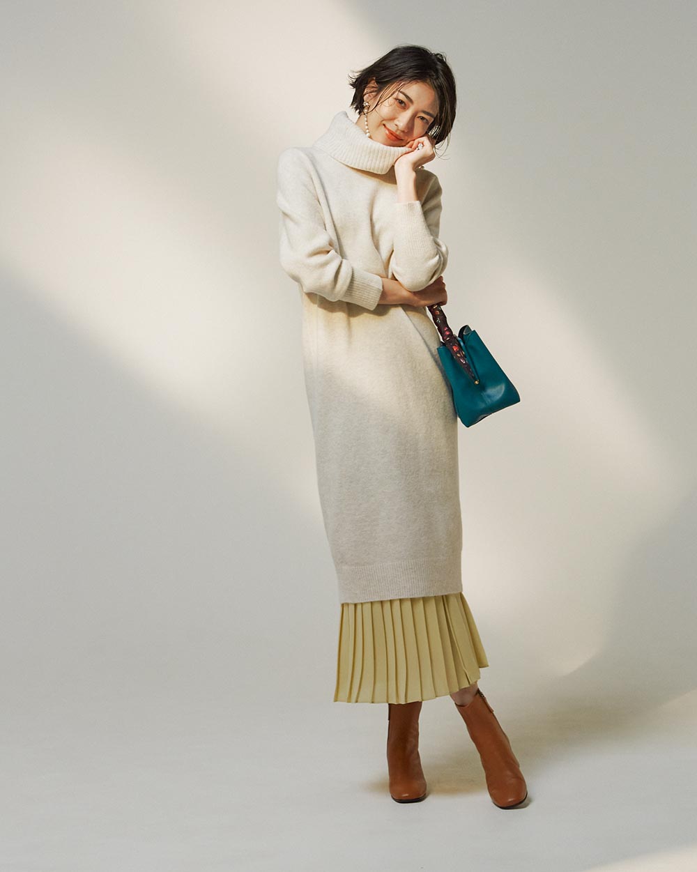 プリーツスカートをきちんと着るのに飽きたらこんなアレンジも。ドッキングワンピースのように、ニットワンピの裾からプリーツをのぞかせるとオシャレ上級者な印象が叶います。スカート¥2,990ワンピース¥3,990(ともにUNIQLO)バッグ¥58,000(ルル ギネス)ブーツ¥40,000(ファビオ ルスコーニ/ファビオ ルスコーニ ヴィオロ 福岡店)ピアス¥12,500(ジェンマ アルス)