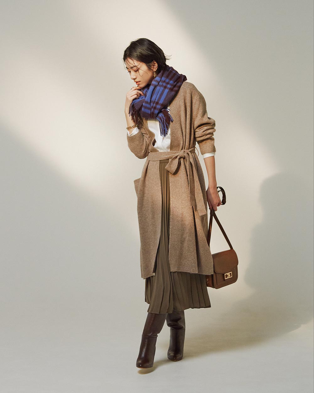 ブラウスやチェック柄ストールを合わせれば、正統派トラッドに楽しめます。スカート¥2,990ニットコート¥3,990ブラウス¥1,990(すべてUNIQLO)バッグ¥5,990(MANGO/ロコンド)ブーツ¥30,000(ダイアナ/ダイアナ 銀座本店)ストール¥57,000(ジョシュア・エリス/グリニッジ ショールーム)ピアス¥13,400(パズコレクティブ/ZUTTOHOLIC)ブレスレット¥4,773(アビステ)