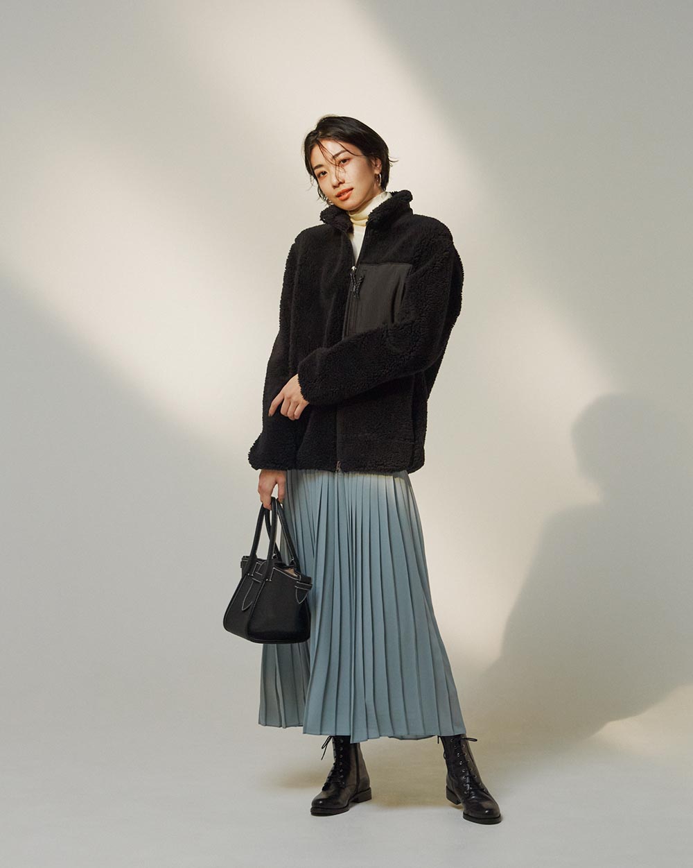 ざっくりしたボアフリース(メンズのMサイズ)やコンバットブーツなど、ボーイッシュカジュアルにプリーツ合わせるバランス感が可愛い。スカート¥2,990ジャケット(メンズ)¥3,990ニット¥2,990(すべてUNIQLO)バッグ¥38,000(ヴァジック/ヴァジックジャパン)ブーツ¥35,000(ファビオ ルスコーニ/ファビオ ルスコーニ ルミネ有楽町店)ピアス¥16,100(ラヒヤ/ZUTTOHOLIC)