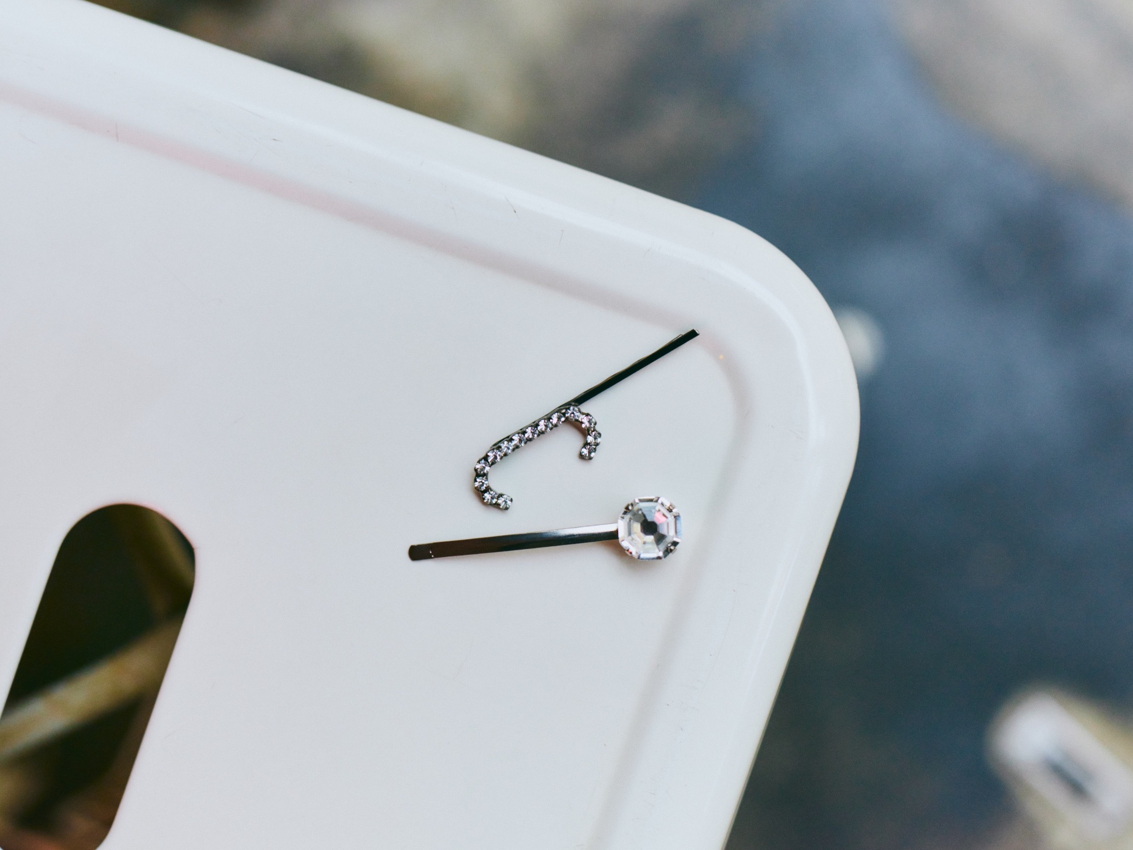 キラキラのイニシャルとストーンをバランスよく重ねて。ヘアピン<ビジュー>¥5,000(acca)ヘアピン<C>¥9,500(LELET NY/ザ ヘア バー トウキョウ)