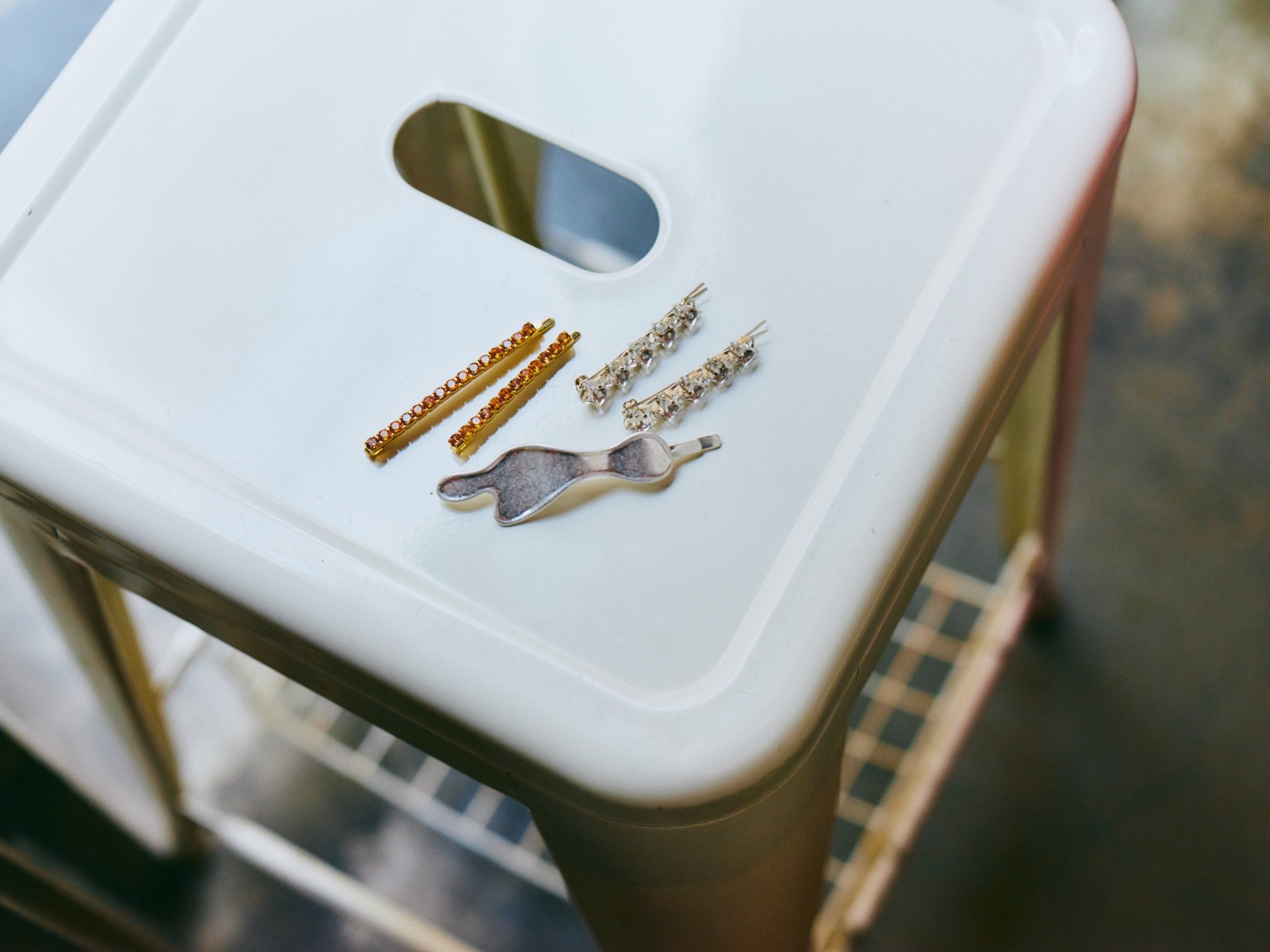 右上から時計まわりに、キラキラでも甘くなりすぎない、大人っぽいスターモチーフ。星ヘアピン[2点セット]¥25,000(JENNIFER BEHR/ザ ヘア バー トウキョウ)アーティスティックなモチーフをモードなアクセントに。シルバーヘアピン¥1,200(アネモネ/サンポークリエイト)シャープなカラーストーンは、コーデの差し色使いにもオススメ。オレンジヘアピン[2点セット]¥7,000(コンプレックッス ビズ)