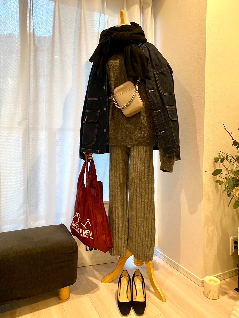 Stall→Jhonstons、Knit→Acne Studios、Pants→Mila Owen、Denim Jacket→UNIQLO、Bag→J &M Davidson、Ecobag→L’Appartement DEUXIEME CLASSE