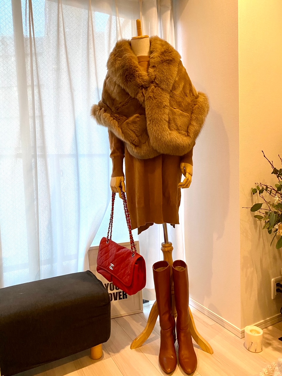 Fur shawls→NO BRAND、Knitonepiece→DEMYLEE、Bag→CHANEL、Boots→Banana Republic