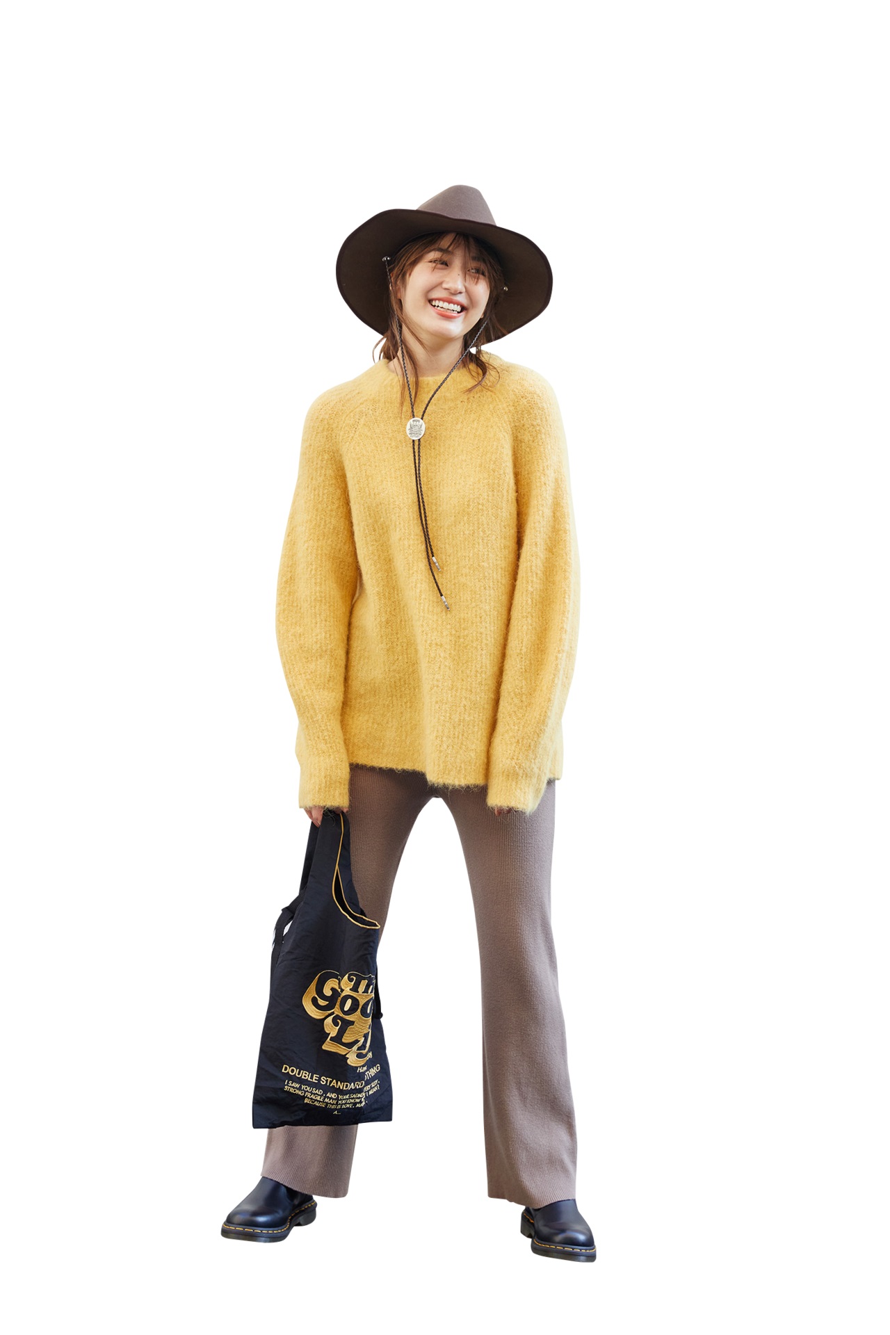 足元にボリュームを出してバランスを取りたいニットパンツの日にも最適。チェルシーブーツ¥24,000(ドクターマーチン/ドクターマーチン・エアウエア ジャパン)イエローニット¥11,000(Mila Owen/Mila Owen ルミネ新宿2店)ニットパンツ¥13,000(カデュネ プレスルーム)ハット¥14,600(CA4LA/CA4LA ショールーム)エコバッグ¥3,800(DSC×Ball&Chian GOOD LIFE/フィルム)