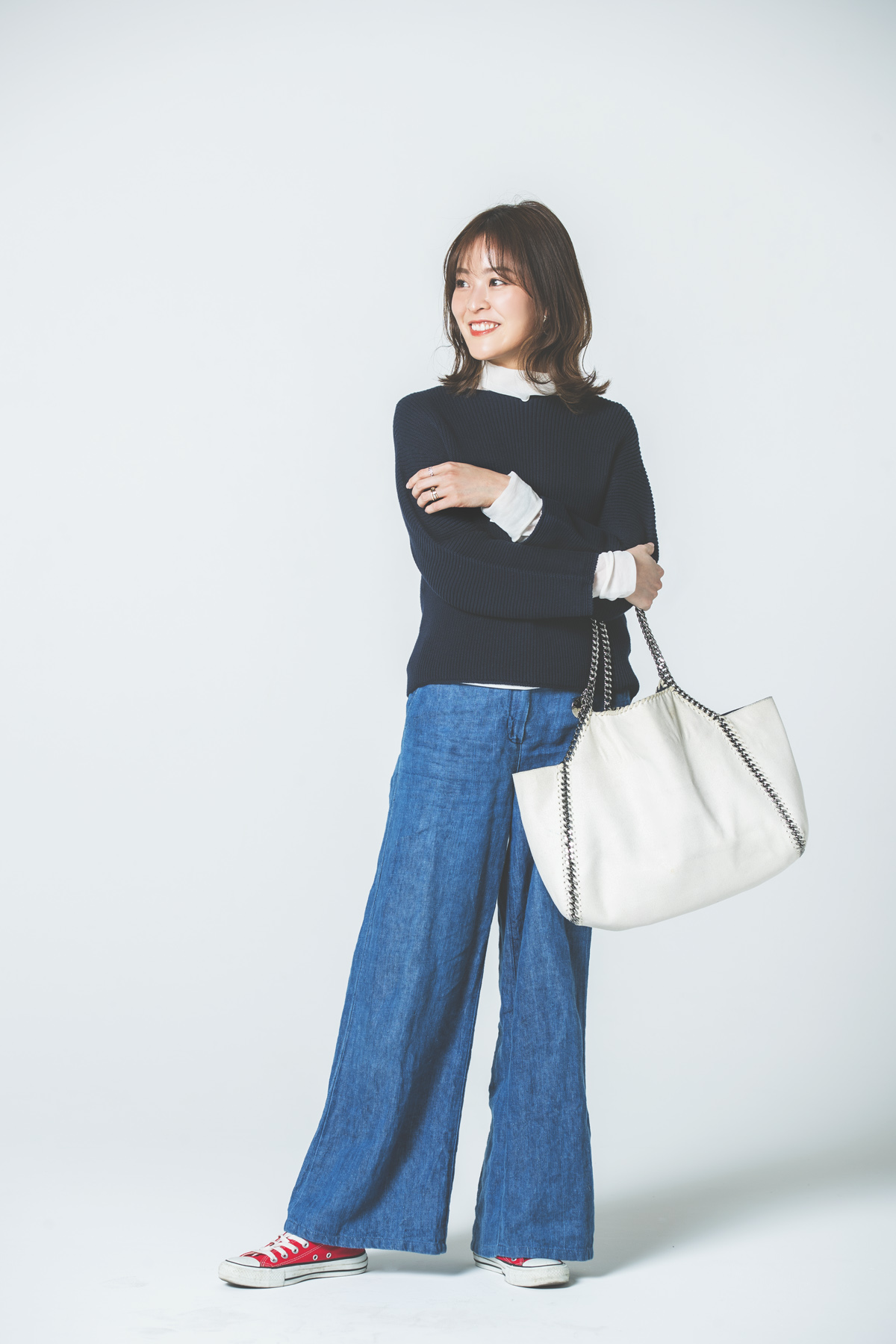 「ネイビーニットといえば、デニムや赤いコンバースのトリコロールカラーで海外の女の子みたいなカジュアルコーデを楽しむのが気分。さらにトップスがシンプルにならないように白のハイネックをレイヤードしたのも、重ね着がトレンドの今シーズンならではのポイント。バッグは大きめを選んでバランスをハズしました」(金城華乃子さん フリーランスライター/マーケター 29歳・162cm)