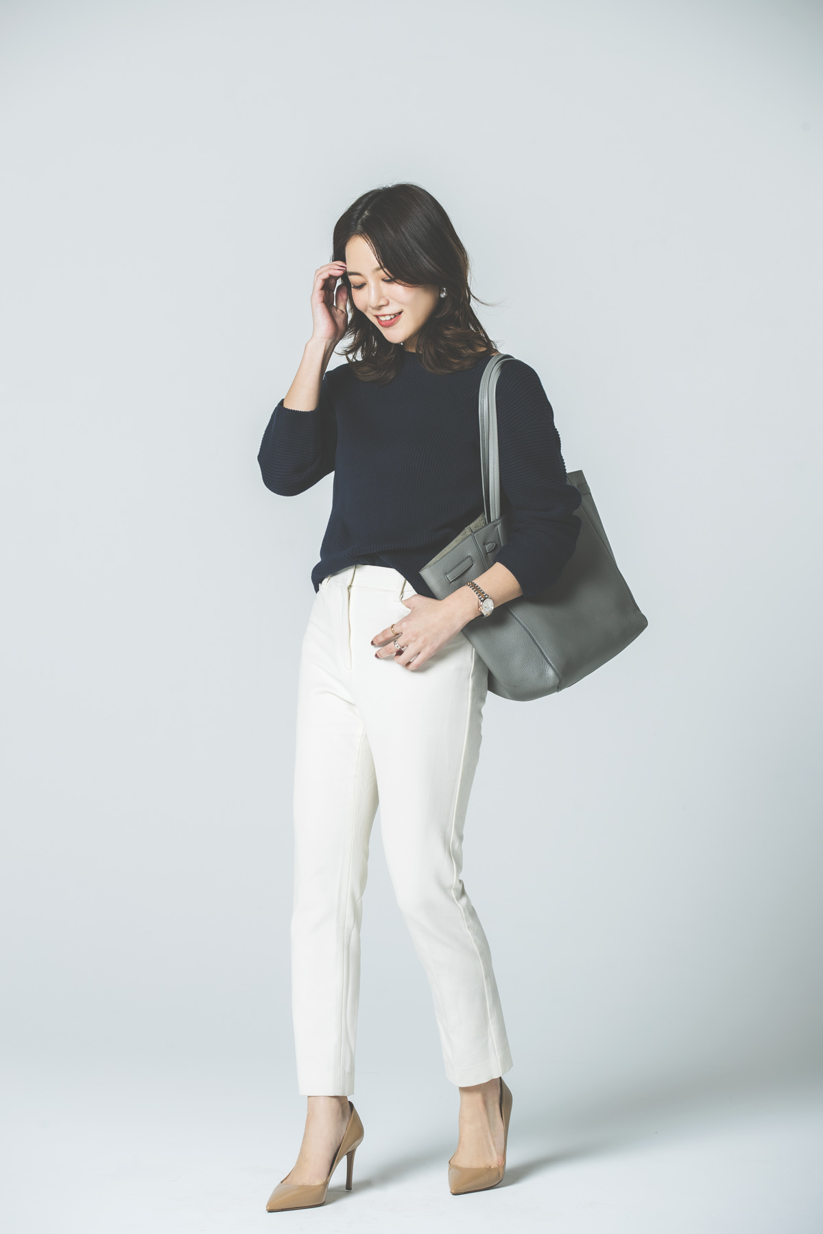 ❹石井里奈さんは白パンツで “きれいめ通勤スタイル”な着こなし