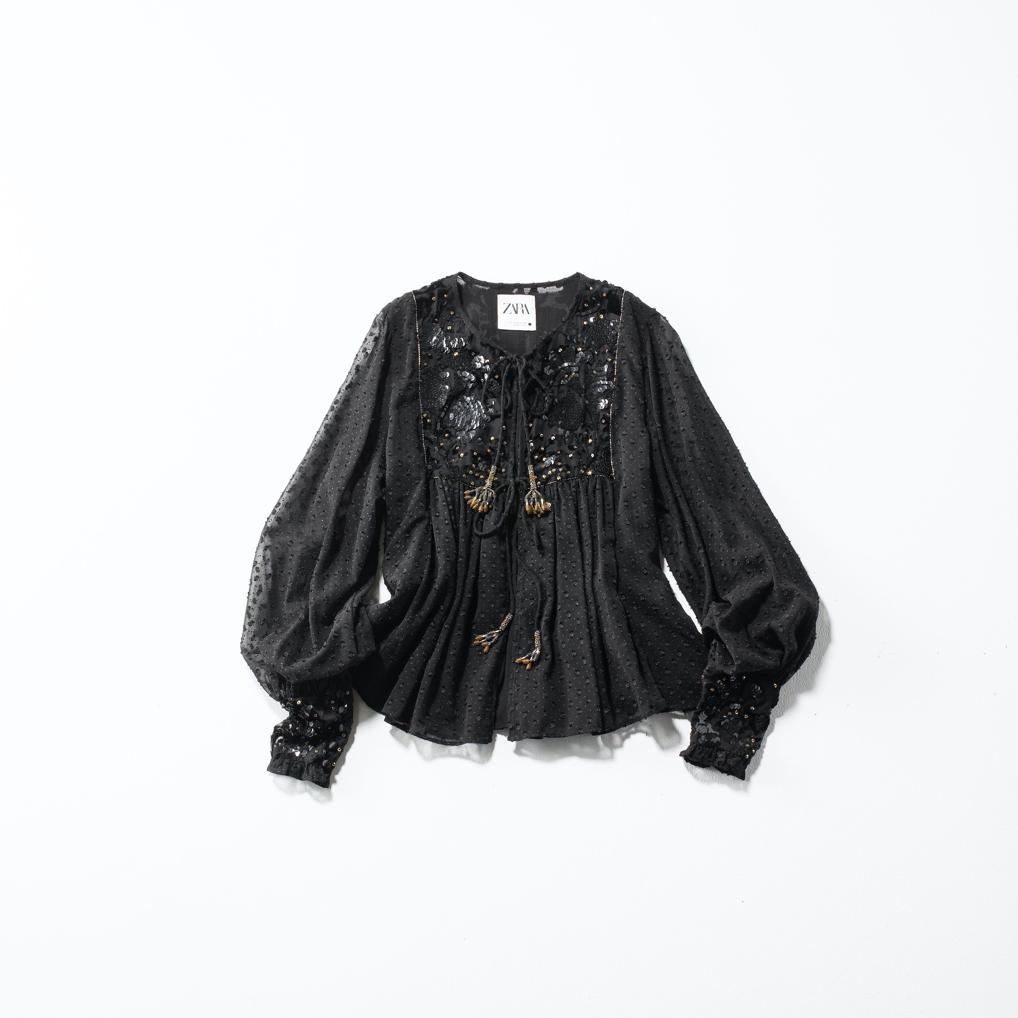 全体に透け感のある素材でフロントのレースアップやスパンコールまで流行をしっかり押さえたブラウス。デザイン性は強めだけどキレイめからカジュアルまで対応。さらにインナーとの合わせ次第で幅広いテイストにマッチ。春まで末長く着られる一枚です。スパンコールブラウス¥8,173(ザラ)