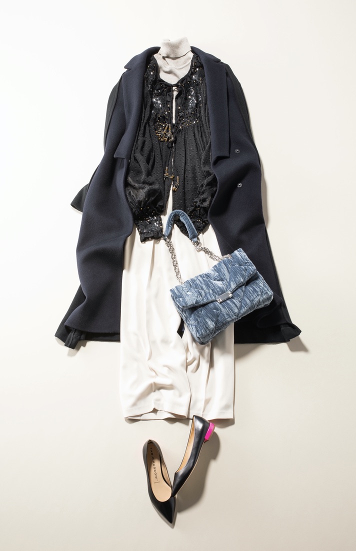 真冬はレイヤードとシルエットをひと工夫して大人っぽく着こなすと◎。たっぷりとしたワイドパンツにAラインを作りつつ、ベージュのタートルをインしてボトムスと繋げれば、縦ラインが強調されてスタイルアップに。仕上げにネイビーのコートを肩掛けすれば知的な印象が演出できます。パンツ以外を同系色にすることでブラウスのデザイン性もちょうどよく引き立ちます。