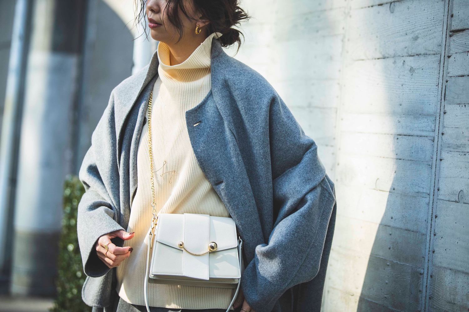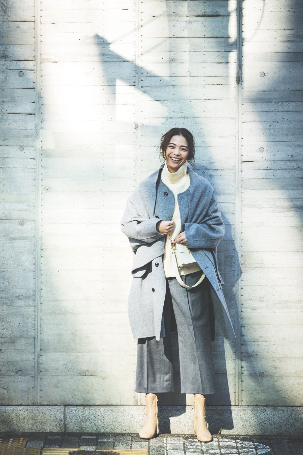 「しっかりとした防寒スタイルなので、外回りが多い時にちょうどいいこのスタイル。グレーと白のツートーンでまとめつつも無難に見えないのはシルエットのおかげ。ちょっぴりワイドな半端丈パンツを選んで、ポンチョのふわっとしたワイドシルエットにより動きを出しているんです。コートとボトムスがボリューミーなので、ブーツは足首がキュッと細身に見えるものを選んでメリハリを。さらに白のニットとリンクさせることでブーツもバッグもベージュ&白系で統一しました」