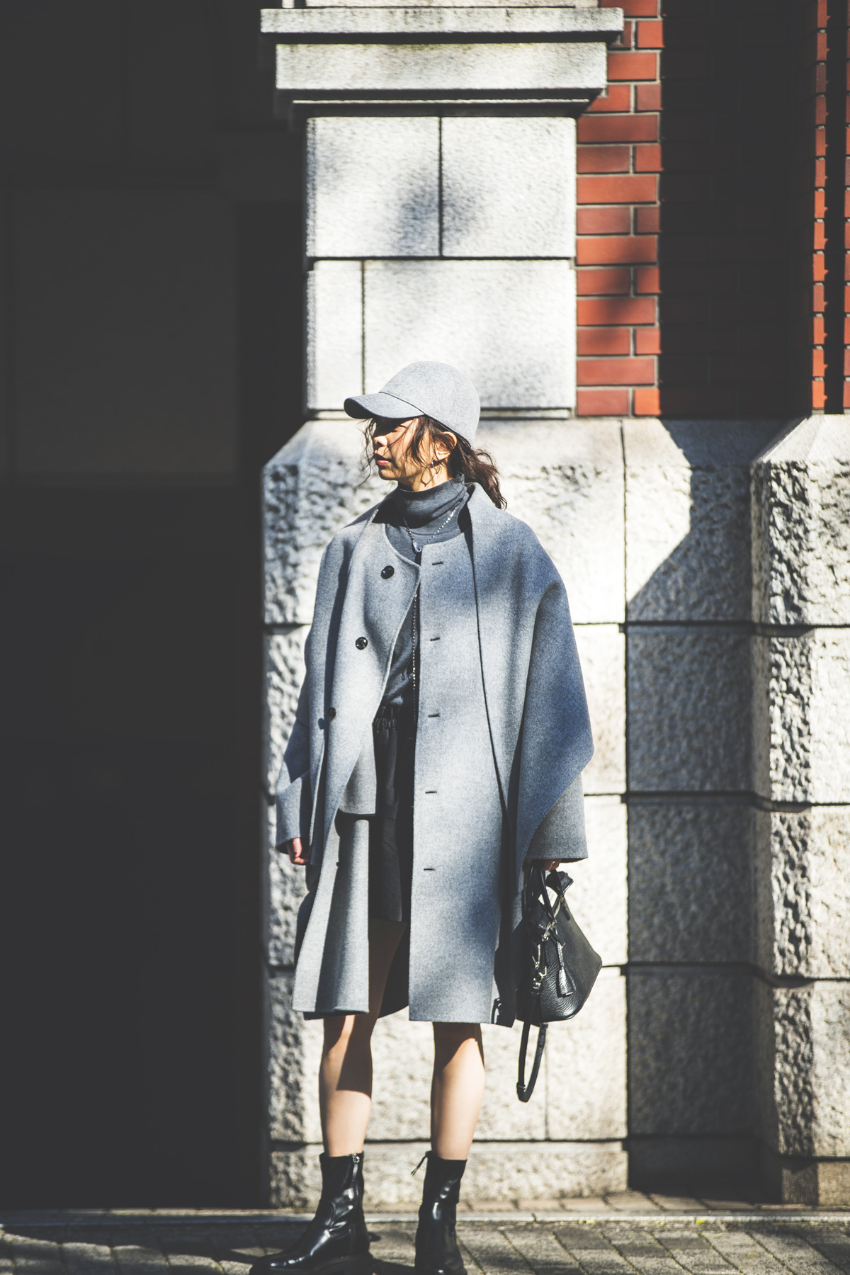 「ちょっとオシャレなお店や女友達とのランチ会は、少し意外性のあるファッションを楽しみます。コーデのポイントはなんと言ってもコートに隠れる丈のミニスカート!セクシーにならないようにゴツめのブーツでカッコよさを、キャップでマニッシュさをプラスしています。その代わりインナーのニットはすっきりと超シンプルなタートルニットを。仕上げに小物もグレーと黒で統一して、小物だけが浮かない様に全体を馴染ませます」
