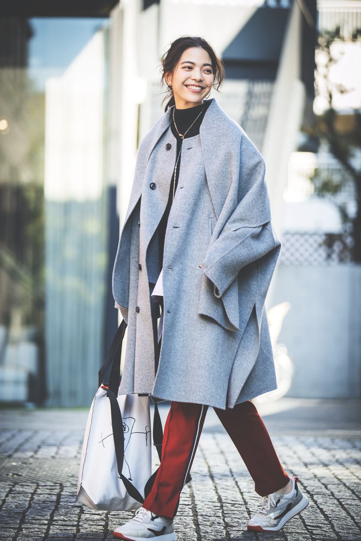「一番私の素に近い、真冬の通常運転スタイルがこちら!オンの日に予定をみっちり組みたい日はだいたいこんな感じで、着ていて楽なスニーカーとスラックスパンツなんです。そしてなんとなく今の気分で“赤”を意識したのがポイント。パンツの赤、バッグの持ち手も赤スニーカーのソールの朱色でリンクさせて。地味になりがちな真冬のコーデが程よくパッと明るく華やぎます」