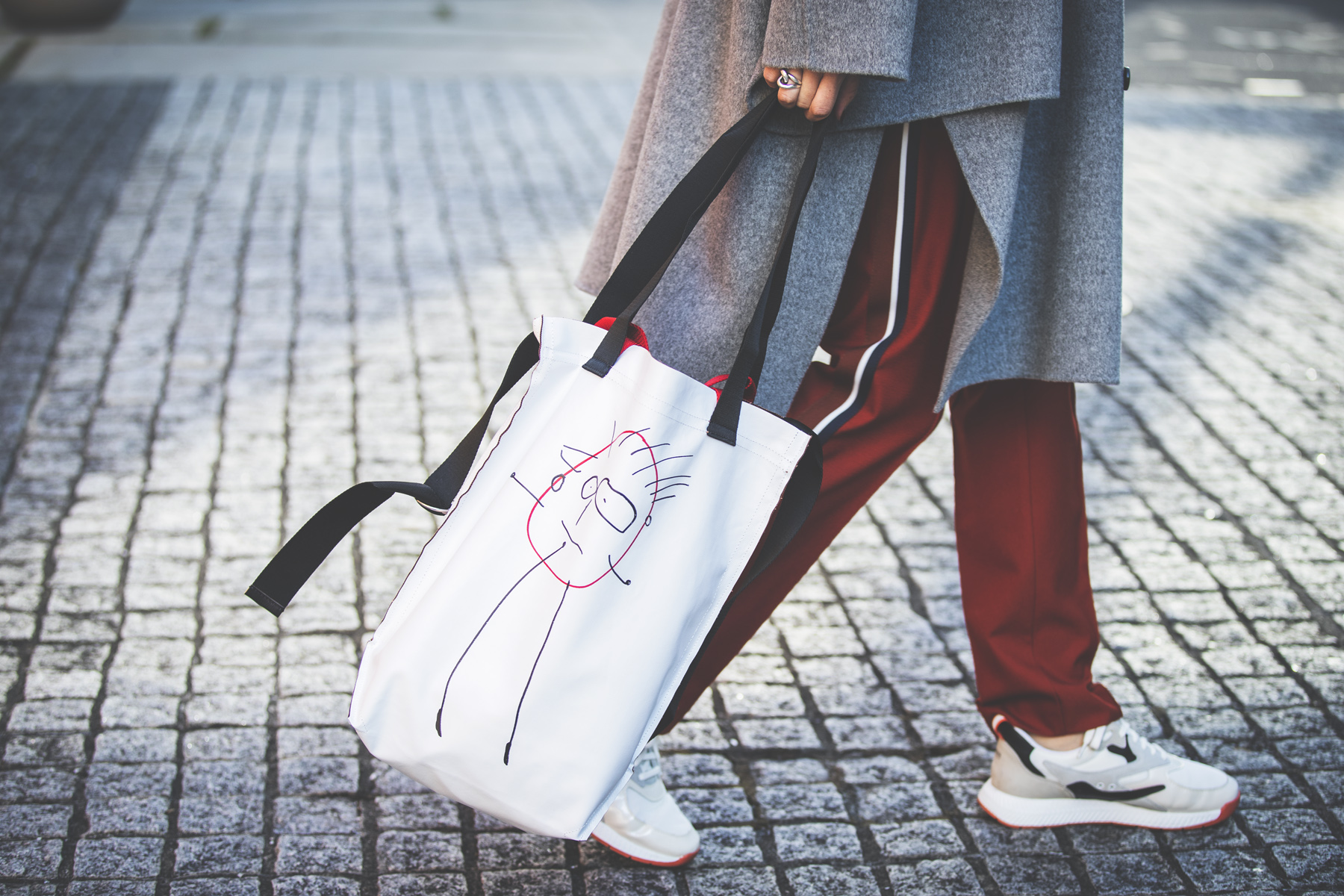 「黒のバッグでカチッとまとめても良いのですが、赤のライン入りパンツにインパクトがある分、バッグは軽くてリラクシーなトートバッグにしました。このバッグ、実は両面でPLANCのオリジナルキャラが描かれているんですよ!ロゴとはまた異なるスタイリングのアクセントになってくれるんです。さらに持ち手が3WAYで使えるうえ、めちゃくちゃ軽量。持ちやす過ぎて、ついヘビロテしてしまうほどです。足元はヒールでも合うのですが、今日はパンツとのカラーリンクでこのスニーカーを選んでよりい一層スポーティに仕上げました」