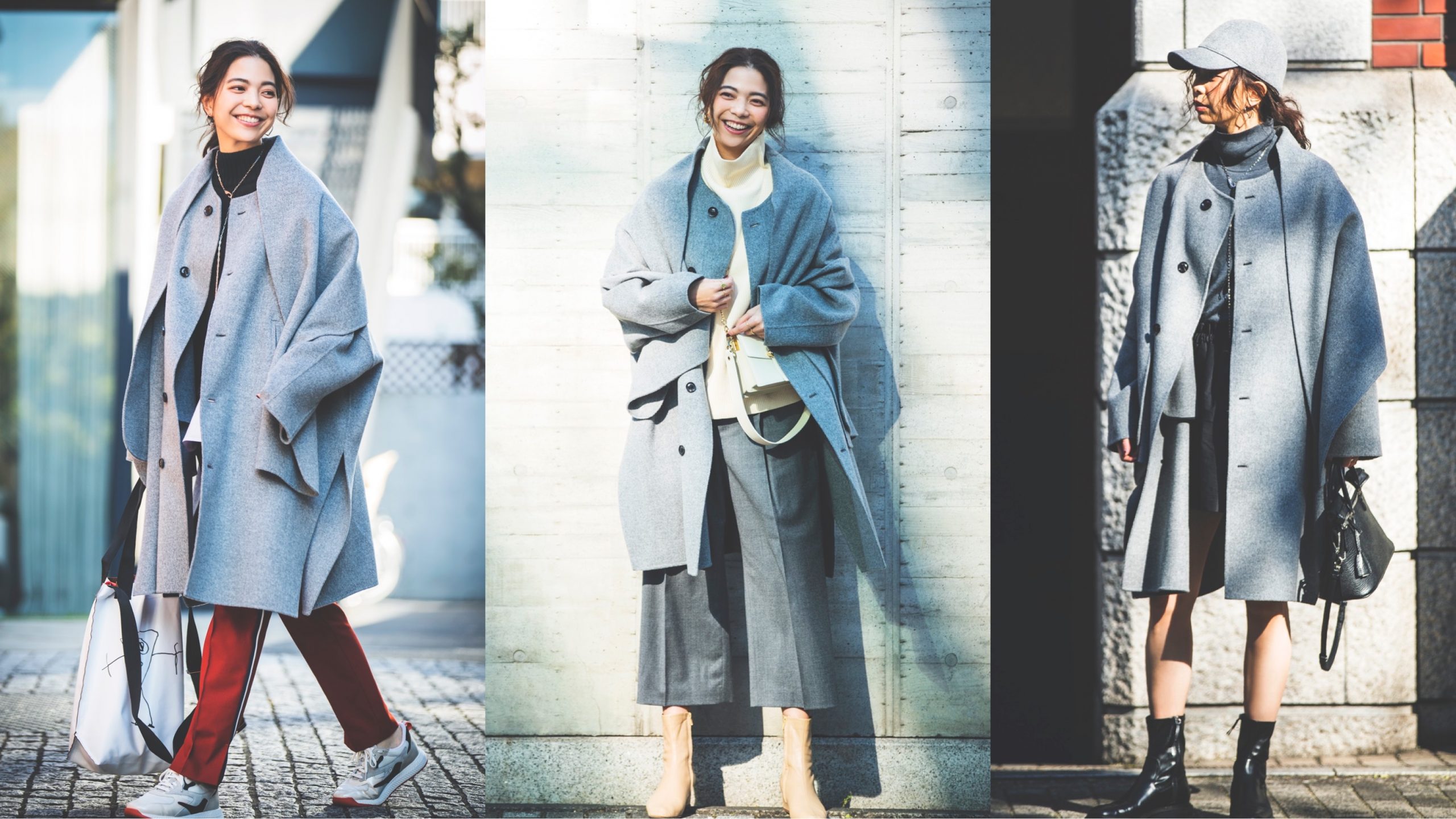❶グレーと白でまとめた優しいツートーンコーデはシルエットのボリューム感で遊んで