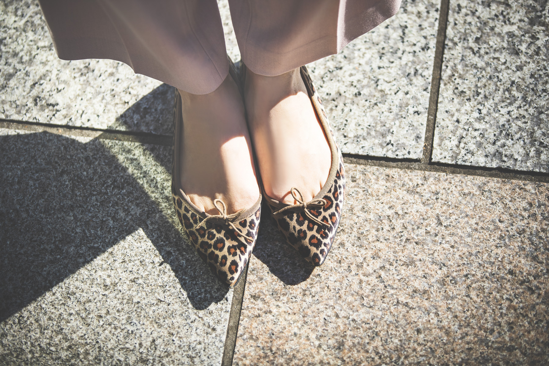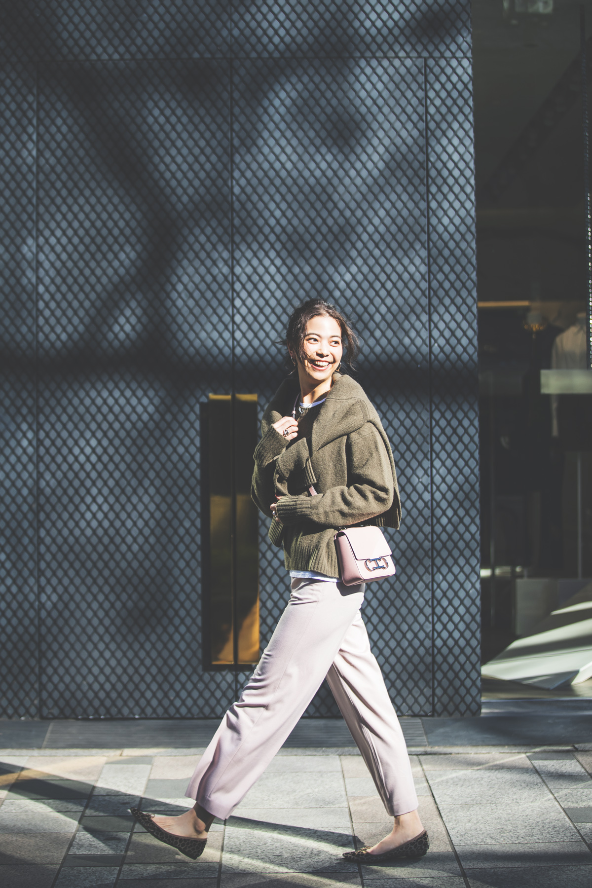 「渋みのある優しいピンクに合わせても浮かないのに、ほどよく足元のアクセントにもなってくれる。そんな絶妙な仕事をしてくれるのがヒョウ柄のフラットシューズなんです。ここでスニーカーにしてしまうと公園スタイルになっちゃうので、とんがりトゥを合わせてキレイめに振るのがポイント!」