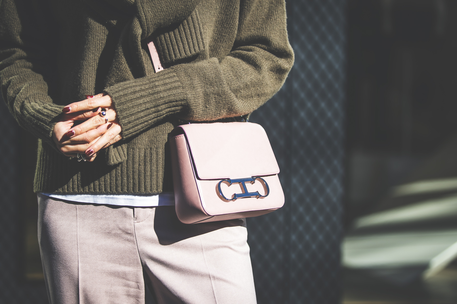 「カーキのニットをカラーで遊ぶなら……意外とピンクが相性GOOD!さらに、ピンクのパンツにピンクのバッグ、ベージュの靴で明るく春らしい雰囲気でまとめました。ショルダーバッグに合わせてヘアは高めのアップで元気な印象にしています。足元はフラットシューズで都会的な感じと女性らしさをプラスします」