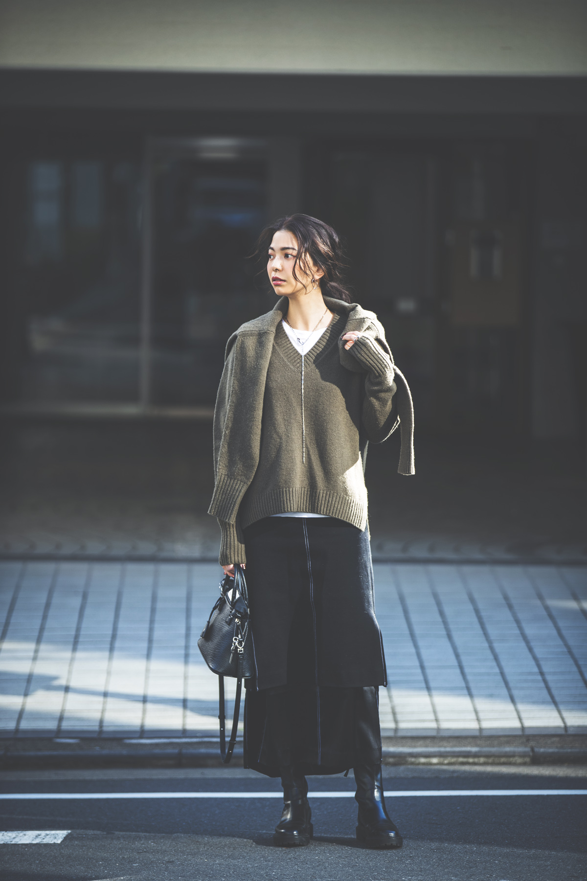 「Vニットを着て丸首をラフに肩がけしつつ、あえてモードに着こなしました。ニットのVネックから白Tシャツをのぞかせて奥行きと抜け感を。こうすることでデザイン性の高いモードなスカートと合わせても、ほどよく肩の力が抜けたカジュアル感が漂うんです。さらに今年はごつめでコロンとしたブーツがトレンドになっているので、足元はすっきりさせすぎずにあえてボリュームを出しました。小物も黒とシルバーで統一してもモード感を高めて。仕事の日はこんなブーツコーデでサクサク街を歩いていますよ!」