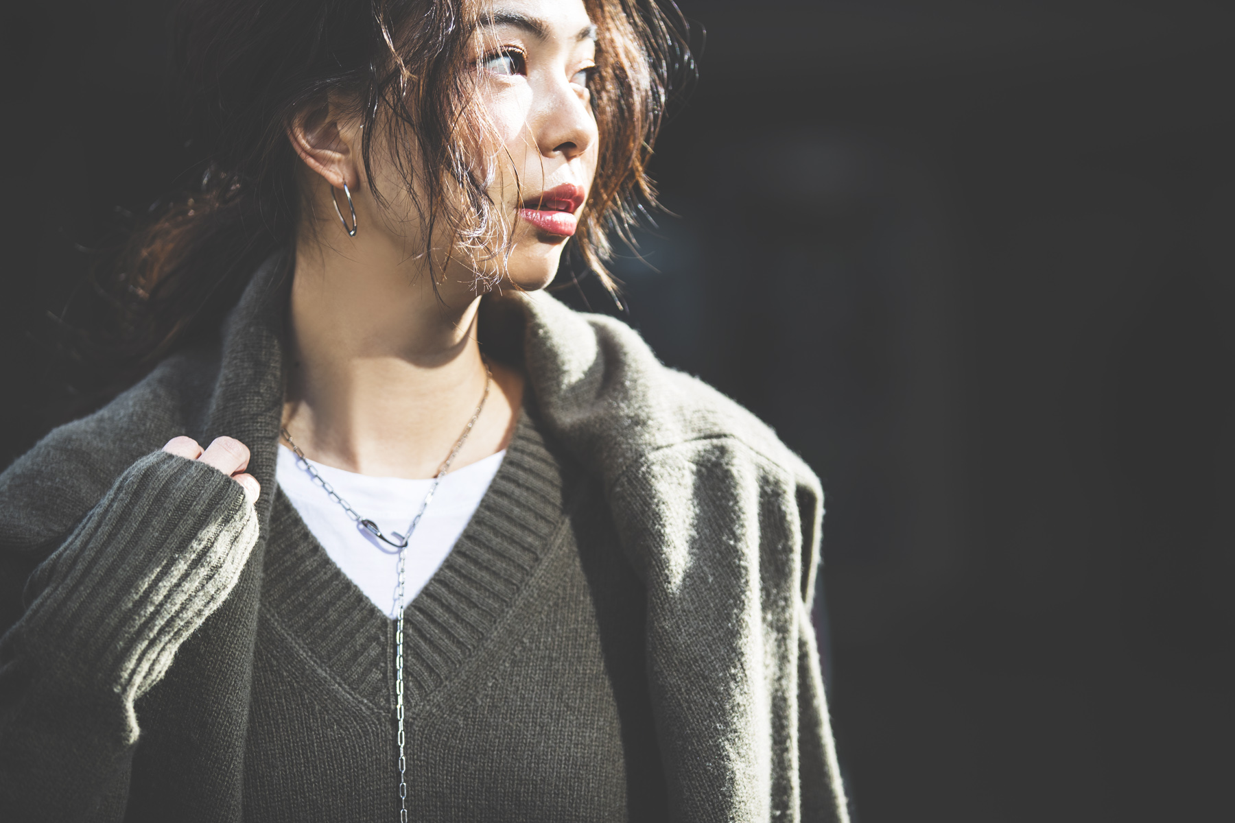 「シーズマーラのネックレスはフックで留められるデザインなので、長さ調整が自由自在。Vニットに合わせるときはフックを少し低めにしています。逆に丸首のトップスのときは少しチョーカー風につけているんです」