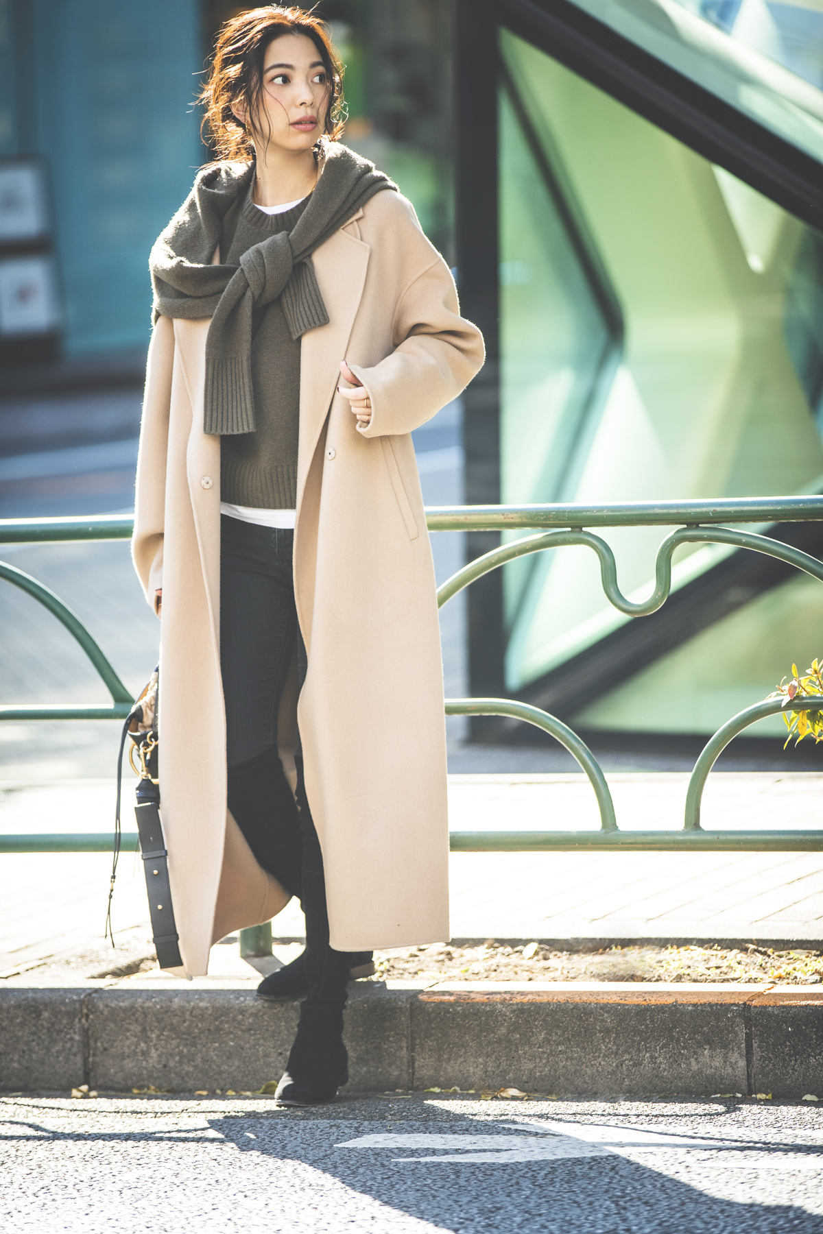 「今の冬のマイ・スタイルのひとつがこちら!ドッキングニットをコートからアウトして着られるのが、このニットでしか出来ない遊び心。しかも少しずらしてラフに結ぶのがカギ。さらにハイパーロングコートをニットに重ねたボリュームのある装いのなので、ボトムスはすっきりとまとめています。またボリュームのあるスタイルの時には、ヘアはアップが基本。一見マニッシュに見えるのですが、スキニーパンツやロングブーツが女性らしいので、私はあえてのデートスタイルに着ちゃいます!」