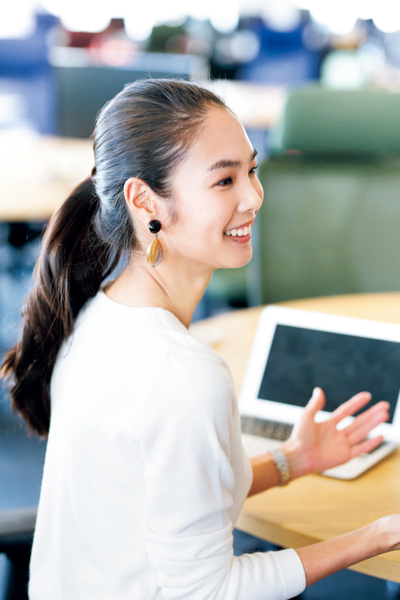 忙しい日はヘアを直す余裕もないのが現実。ポニーテールな ら、夜まで崩れず元気な印象に。さらに大ぶりピアスをつければ、疲れ顔から視線をそらせます。(藤田有咲美さん、27歳、商社)
