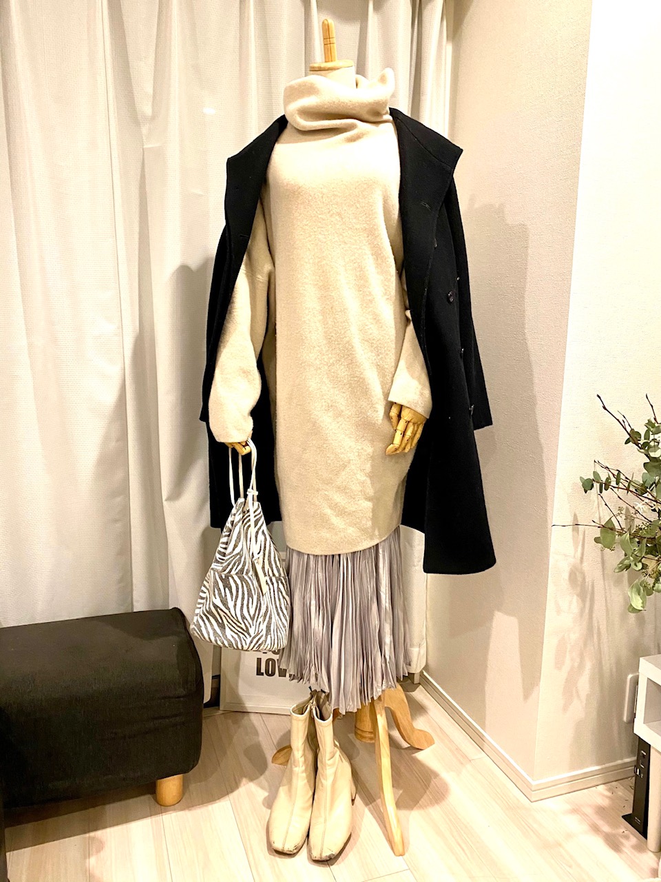 マニッシュな着こなしが得意な骨格タイプですが、デートのときは女性らしくしたいもの。ニットワンピにプリーツスカートをちょい出しすることでそれが叶います。白っぽくまとめるとハンサムさとフェミニンさを両立。