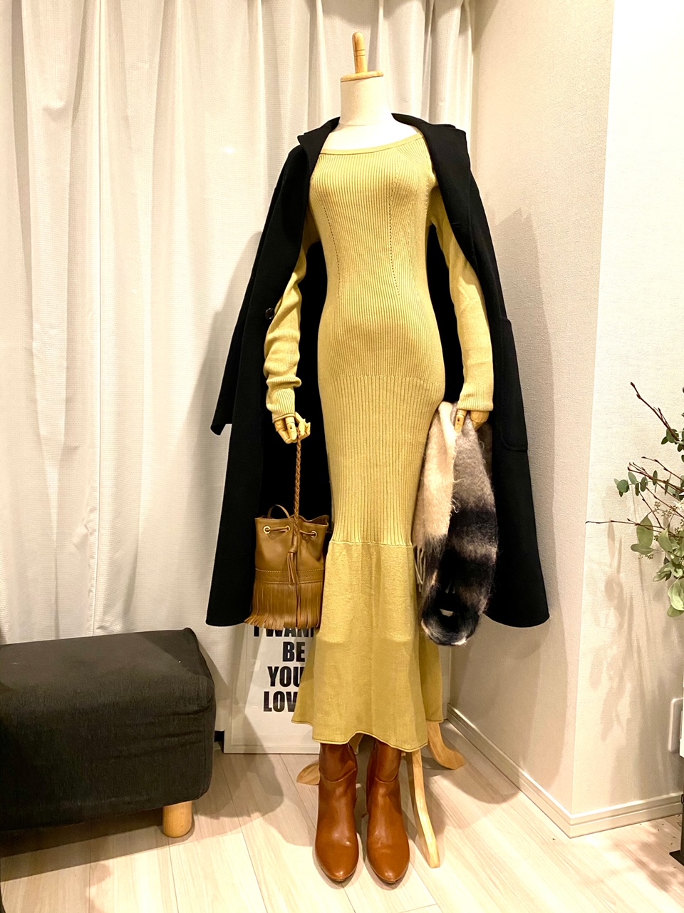 ニットワンピを主役に重ね着で女性らしく仕上げて