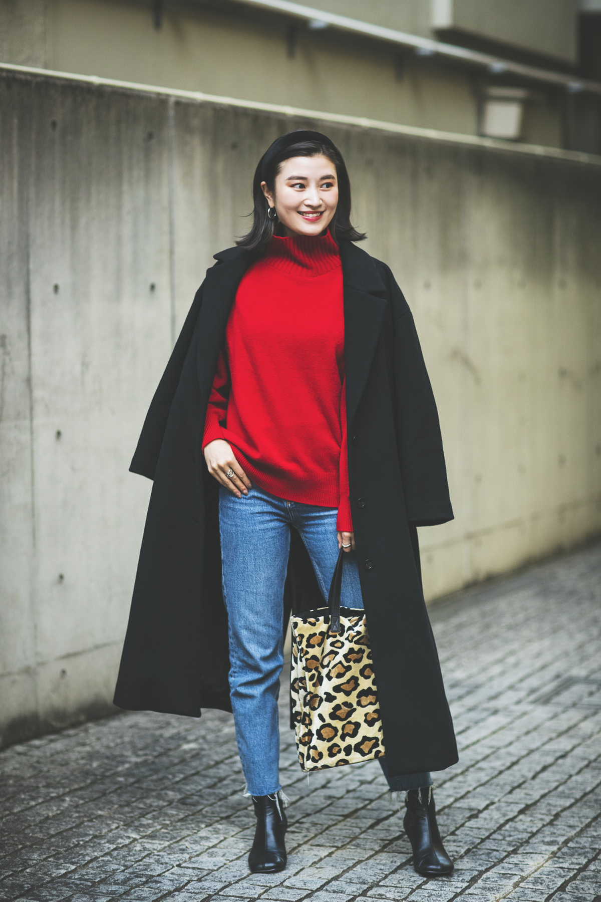 「このニットは袖が少しふわっと広がっているデザインで、コートを脱いだ時もオシャレに見えます。やっぱり赤ニット×デニムの組み合わせは最高! 黒のロングコートやブーツで全体を引き締めました」