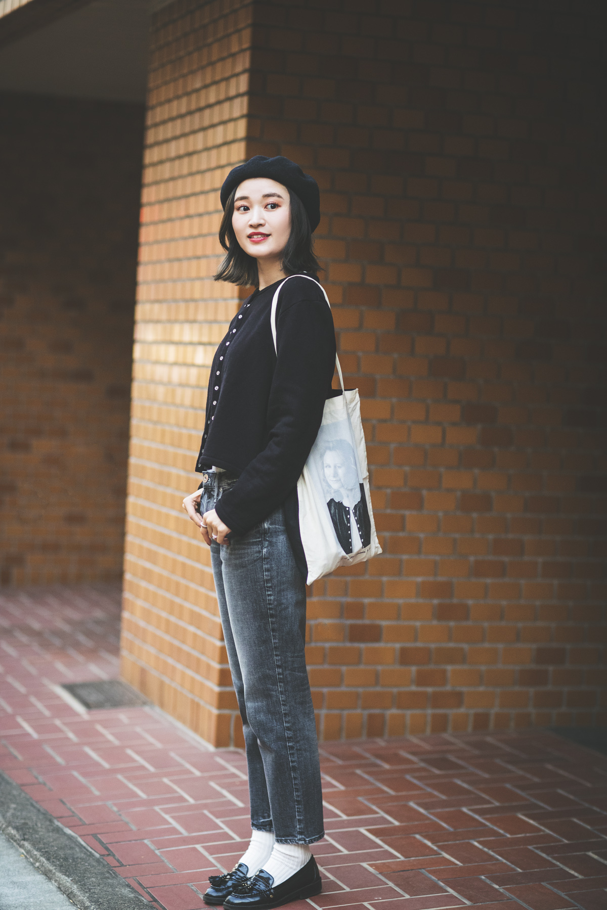 「デニムは程よくゆとりがあるシルエットで脚のラインを拾わず、足首が出るので細見えするのが嬉しいです。カーディガンやベレー帽、白ソックスを合わせてフレンチコーデを意識しました」
