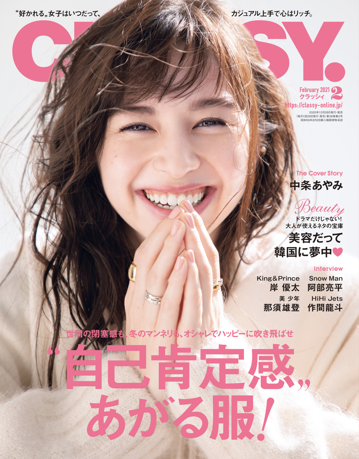 CLASSY.2月号が本日発売!表紙には中条あやみさんが初登場。ハッピー感満載の笑顔が目印です。特集は「”自己肯定感”あがる服!」。今の世の中のキーワードである”自己肯定感”。自分の存在を肯定的に受け止められる感覚…それをファッションが持つパワーであげていこう♡という、2020年の終わり〜2021年の始まりにぴったりの内容になっています!他にも、桜井玲香(元乃木坂46)、鈴木愛理、岸 優太(King & Prince)、阿部亮平(Snow Man)、那須雄登(美 少年)、作間龍斗(HiHi Jets)、小関裕太…など有名人も続々登場!見どころをご紹介します。
