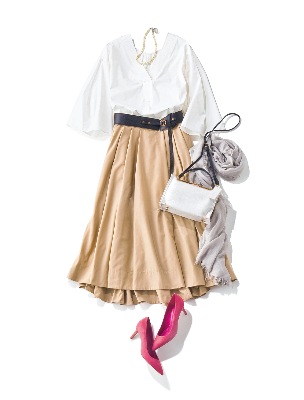 ブラウス¥13,500(エミ アトリエ/エミ ニュウマン新宿店)スカート¥ 18,000(ガリャルダガランテ/ガリャルダガランテ 表参道店)ベルト¥6,500(アクアガール/アクアガール丸の内)ストール¥13,000(マリアーニ/ユナイテッドアローズ 丸の内店)バッグ¥34,000(POTIOR/ショールーム セッション)パンプス¥30,000(ファビオ ルスコーニ/ファビオ ルスコーニ六本木店)ネックレス¥7,778(アビステ)