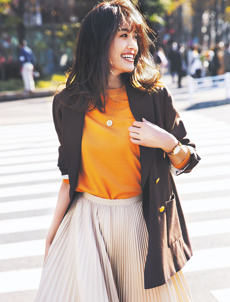着るだけであか抜けるブラウンのジャケット。相性がいいのはオレンジ~イエロー系のビタミンカラー。スカートは明るいベージュで抜け感を。ニット¥9,000(ハッシュニュアンス)ジャケット¥36,000(デミルクス ビームス/デミルクス ビームス新宿)スカート¥39,000(THIRD MAGAZINE)スカーフ¥16,000(マニプリ/ノーリーズ&グッドマン銀座店)ネックレス¥7,640(チビジュエルズ/チビジュエルズ・ジャパン)時計¥19,000(モックバーグ/エイチエムエスウォッチストア表参道)