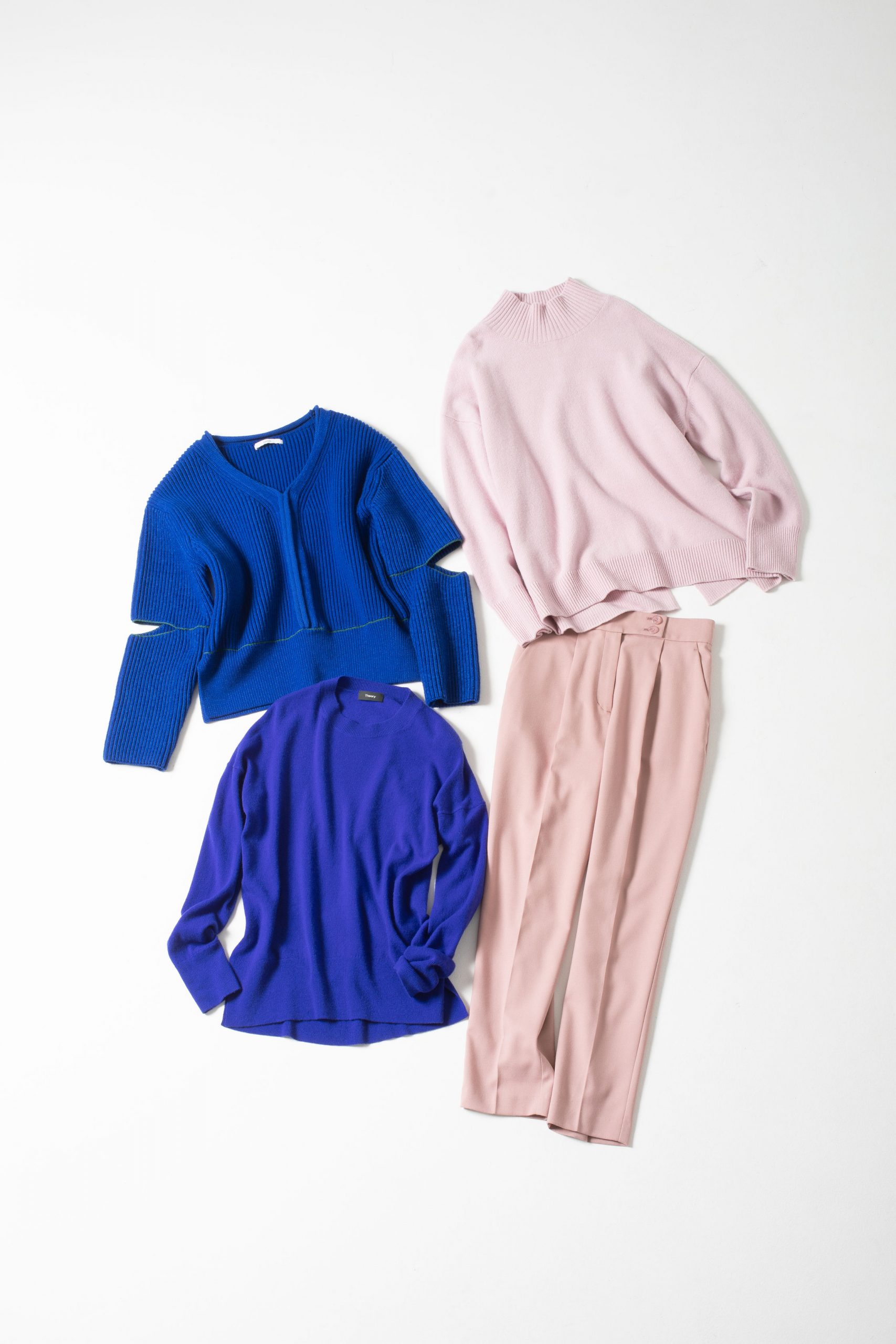 [左上から時計回りに]一枚着るだけでサマになるデザインが秀逸。ロイヤルブルー袖カットデザインニット¥28,000(アンスリード/アンスリード青山店)、パステル調のくすみピンクは大人でも着られて顔まわりも華やぐ優秀アイテム!ピンクニット¥20,000(ジャスグリッティー)、ピンクの可愛らしさに抵抗がある人はボトムスで取り入れてみるのも手です。ピンクパンツ¥19,000(カデュネ プレスルーム)、ラッキーカラーのロイヤルブルーだけでなく、上質なカシミヤ素材であることも開運ポイント。ロイヤルブルーカシミアニット¥36,000(Theory)