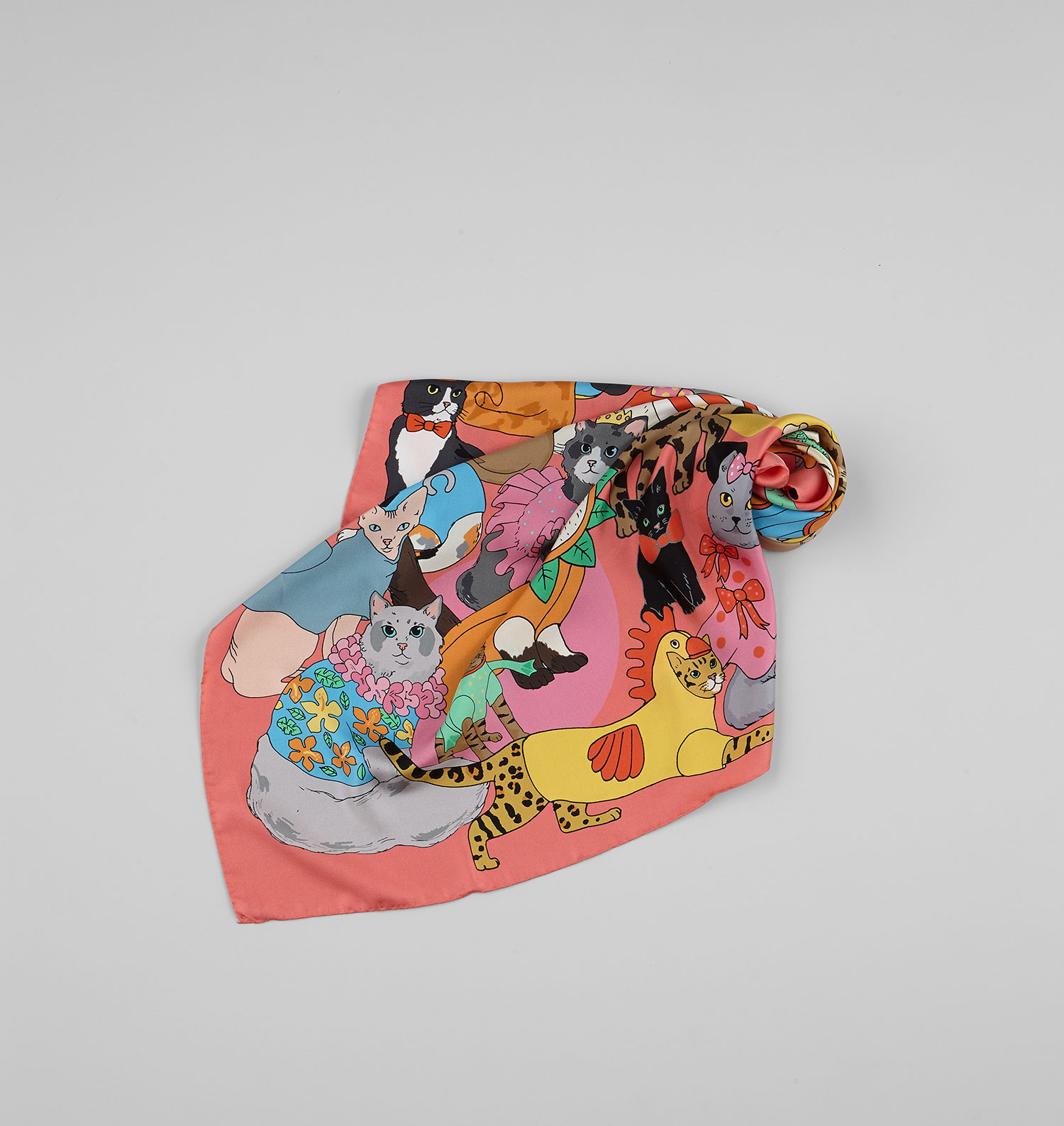 新しいスカーフを探していたとき、Whim Gazetteのプレスの方が見せてくれて一目惚れ。猫がいっぱいプリントされているので、猫好きの私には堪りません!(スタイリスト 児嶋里美さん)