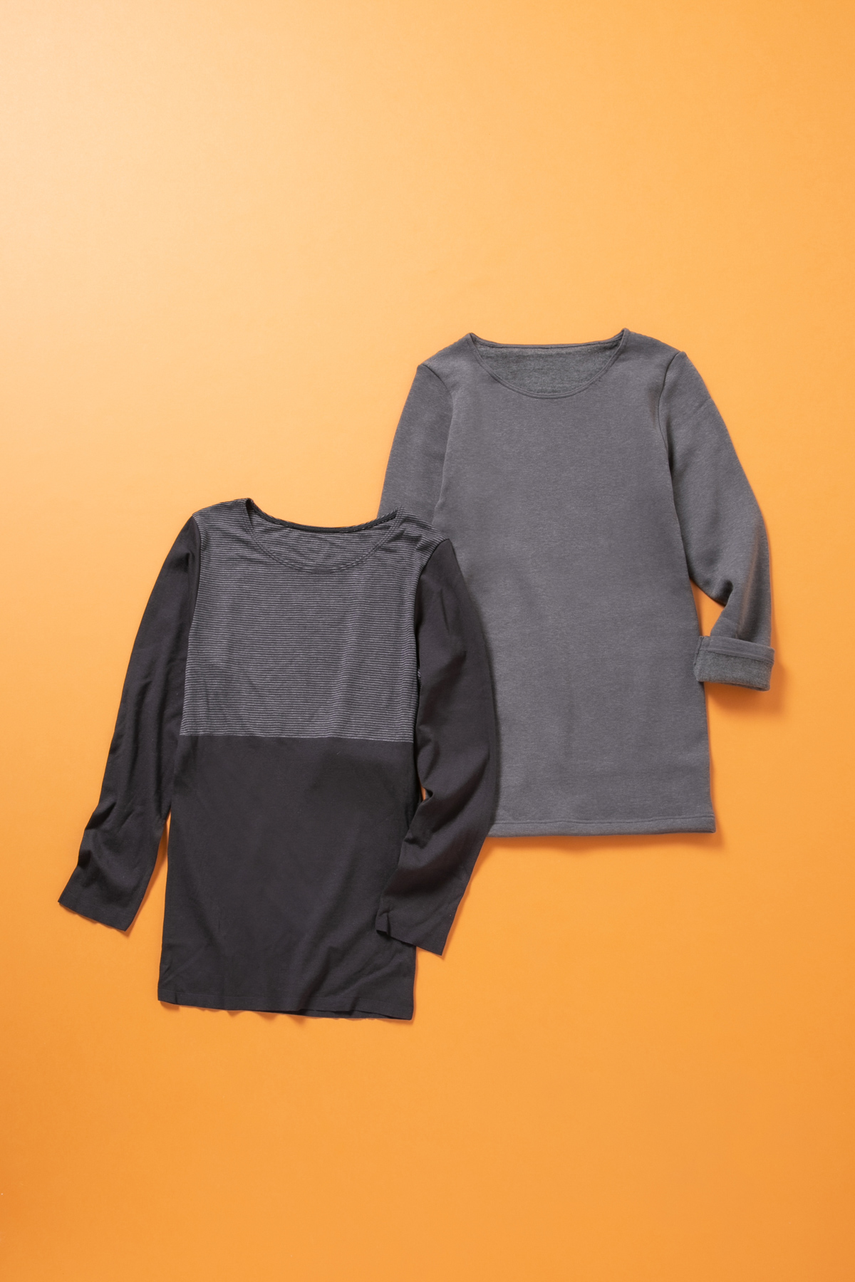 <左>ボーダー部分に吸湿発汗繊維を使用して、冷えるポイントを集中的に暖め。衿ぐりも少し狭く設定され首回りまでポカポカ。インナー¥1,800(ホットマジック/グンゼ)
