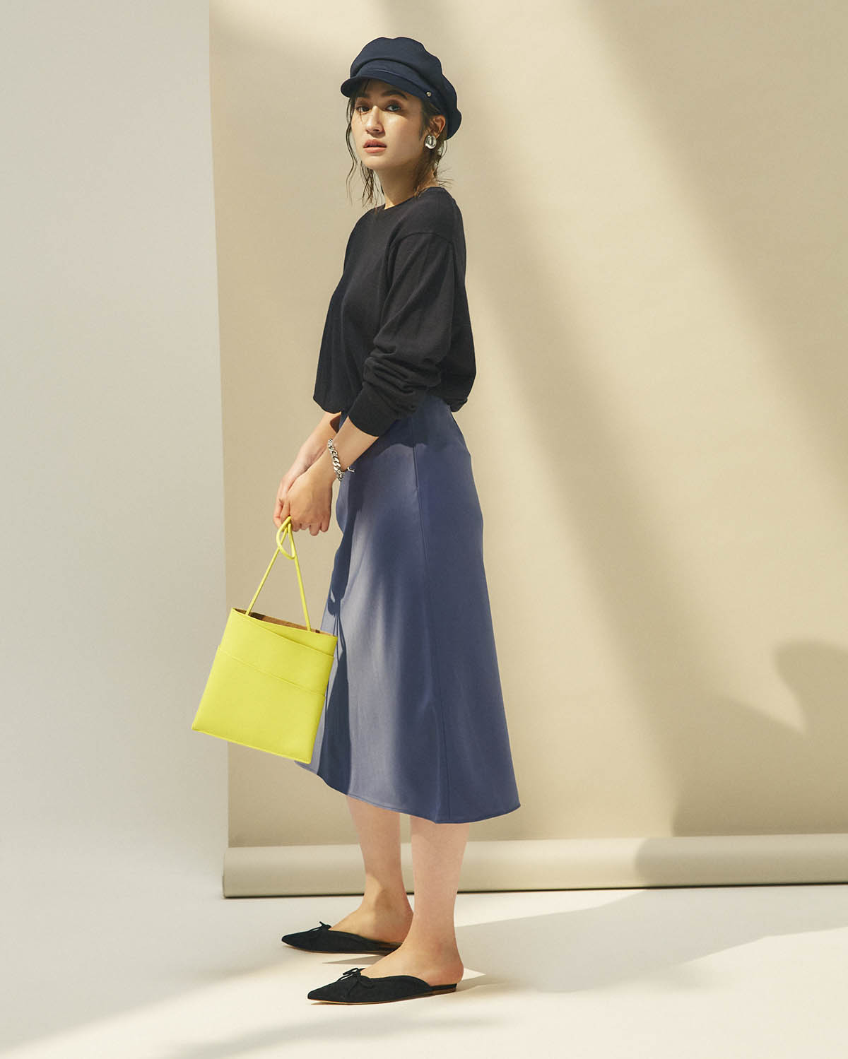 ウォッシャブルコットンメリノクルーネックセーター¥1,990サテンナノーフレアスカート¥2,990(ともにユニクロ)帽子¥11,000(CA4LA/CA4LA プレスルーム)バッグ¥15,000(ノマディス/ノーベルバ)フラットシューズ¥29,000(PIPPICHIC/ベイジュ)イヤリング¥2,864(アビステ)ブレスレット¥8,500(イン ムード/フォーティーン ショールーム)