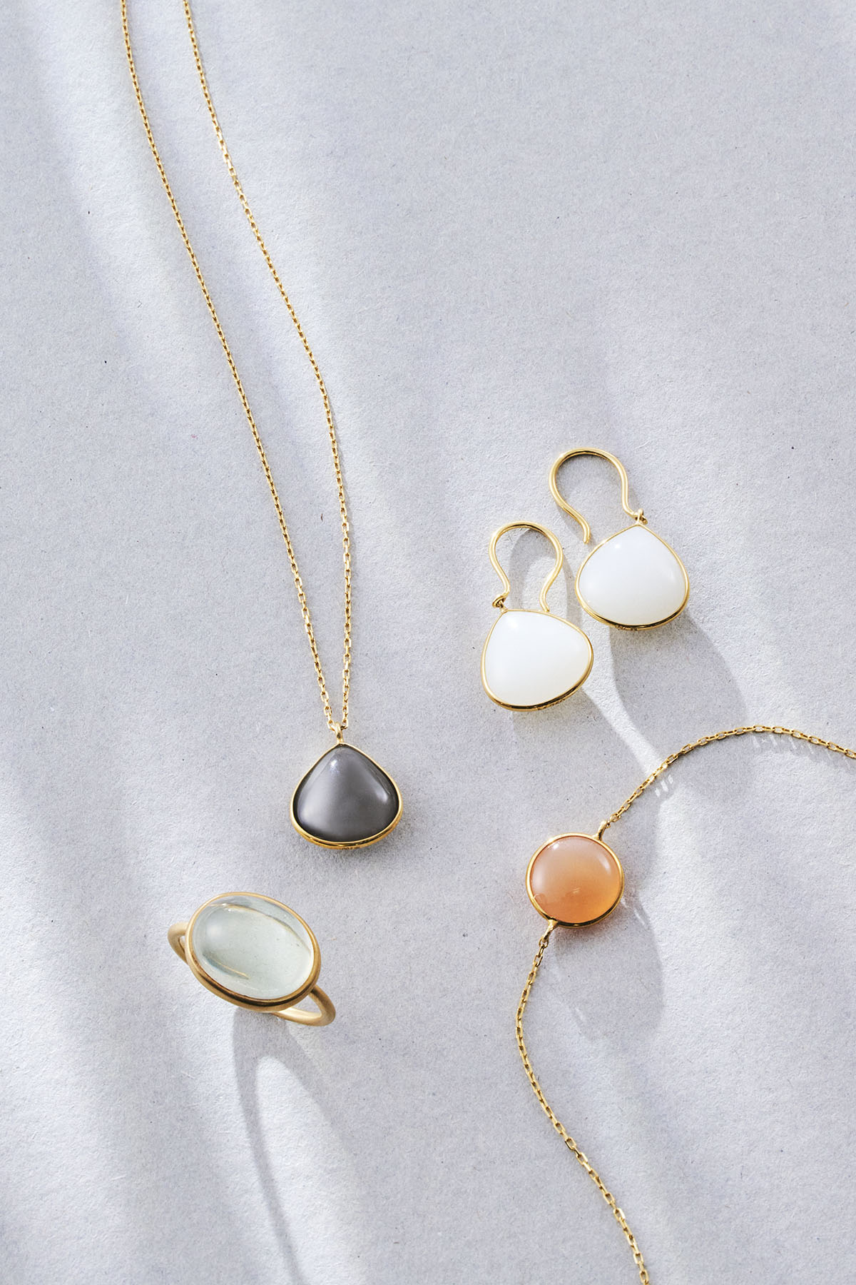 左下/「アースドロップス」リング[グリーンムーンストーン×18金イエローゴールド]¥173,000※一点もののため石のサイズによって価格が異なります 左上/「メルティングライト」ネックレス[グレームーンストーン×18金イエローゴールド]¥66,000 右上/「メルティングライト」ピアス[ホワイトムーンストーン×18金イエローゴールド]¥88,000 右下/「メルティングライト」ブレスレット[オレンジムーンストーン×18金イエローゴールド]¥60,000(すべてマリハ)
