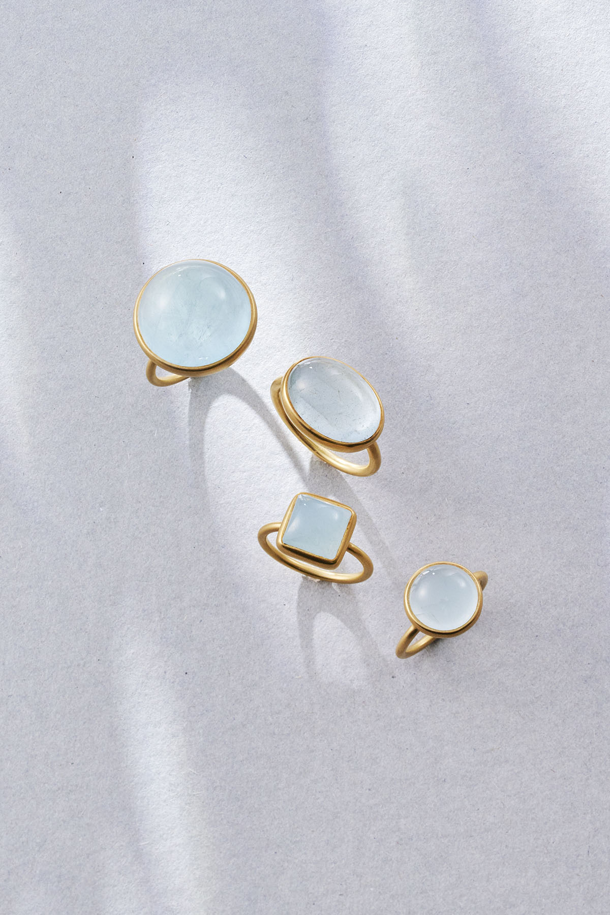上/「アースドロップス」リング[アクアマリン×18金イエローゴールド]¥280,000 中上/アースドロップス”リング[アクアマリン×18金イエローゴールド]¥207,000 中下/「アースドロップス」リング[アクアマリン×18金イエローゴールド]¥179,000 右/アースドロップス”リング[アクアマリン×18金イエローゴールド]¥155,000〈※すべて一点もののため石のサイズによって価格が異なります〉(すべてマリハ)