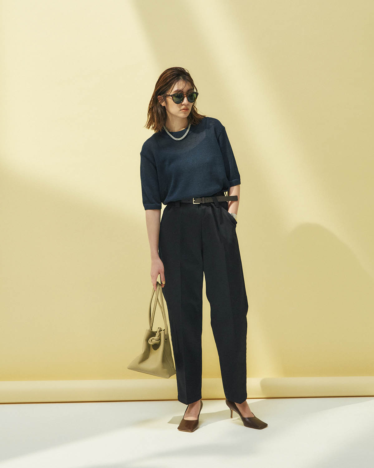 レギュラーフィットワークパンツ¥3,990コットンブレンドクルーネックセーター¥2,990〔ともに一部店舗のみで販売〕〈ともにユニクロ ユー〉ベルト¥2,990(すべてユニクロ)バッグ¥37,000(ヴァジック/ヴァジックジャパン)パンプス¥32,000(PIPPICHIC/ベイジュ)サングラス¥34,000(モスコット/モスコット トウキョウ)ネックレス¥7,855(アビステ)バングル¥18,000(イン ムード/フォーティーン ショールーム)