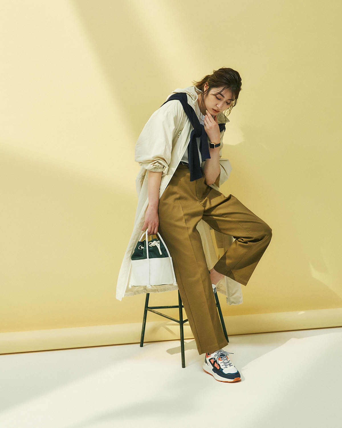 「春らしいライトな素材感のアウターをプラスして、スポーティな雰囲気に。男性は少し落として腰で履くのかもしれませんが、女性が着るとハイライズっぽくなるので腰位置が高く見えます」(大野さん)