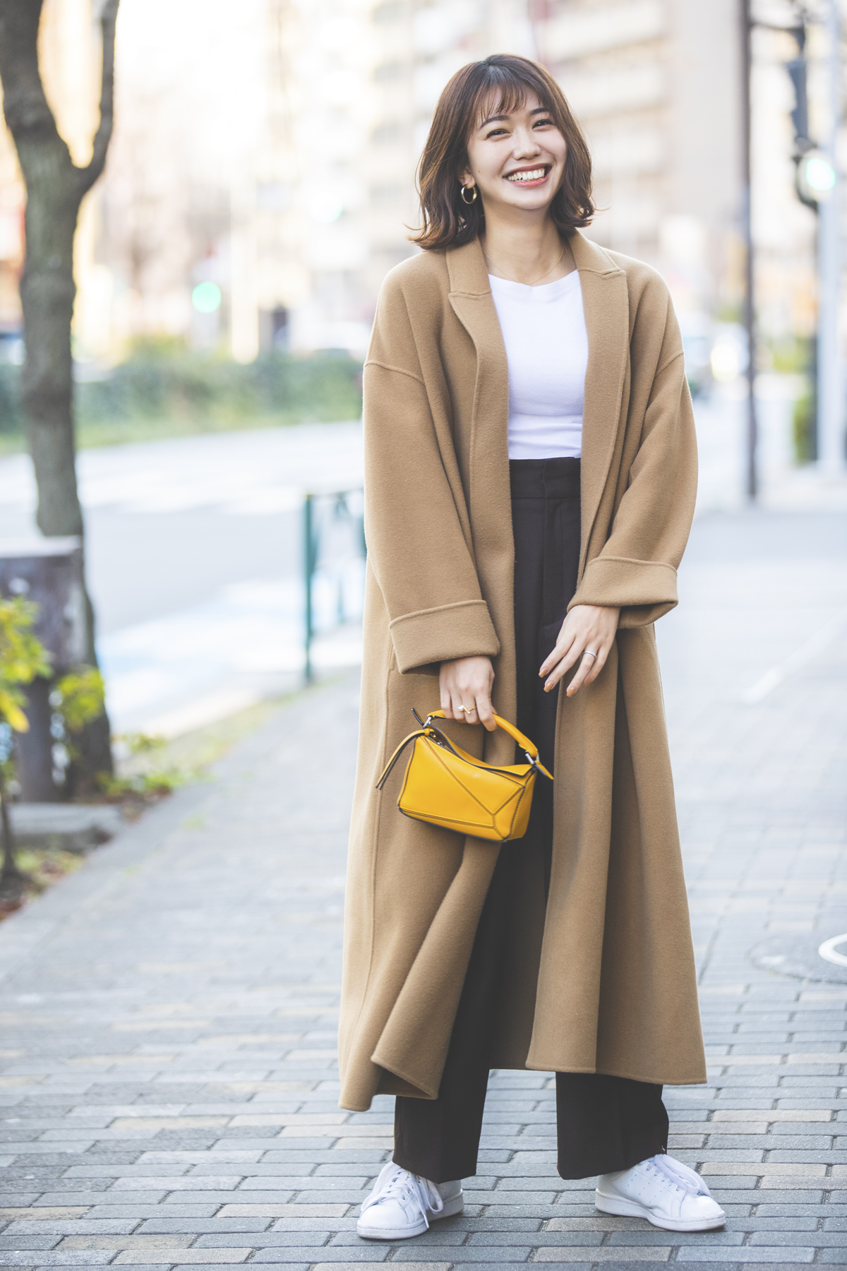コロンとした立体的なフォルムがチャーミングなパズルバッグは、トレンドのミニサイズを選びました。小さいのでパッと華やぐ鮮やかなイエロー。鮮やかな色味ですが、どんな色味のお洋服に合わせやすいので気に入っていて、今日は茶系コーデの差し色として投入しました。(川森麻海さん アパレル関係・27歳)