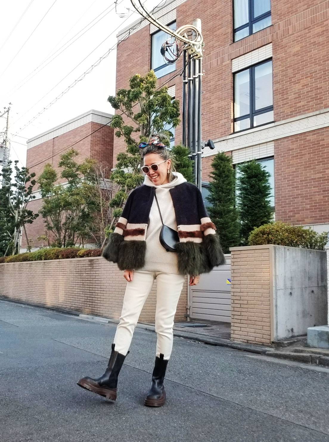 ヒールバッグは、小ぶりのサイズ感とシンプルなデザインが気に入って、コーデを引き締めてくれる黒をチョイス。白系でまとめたインナーのアクセントとして取り入れました。アウターとブーツにボリュームがあるので小ぶりのバッグがぴったりです。(濱口沙世子さん スタイリスト)