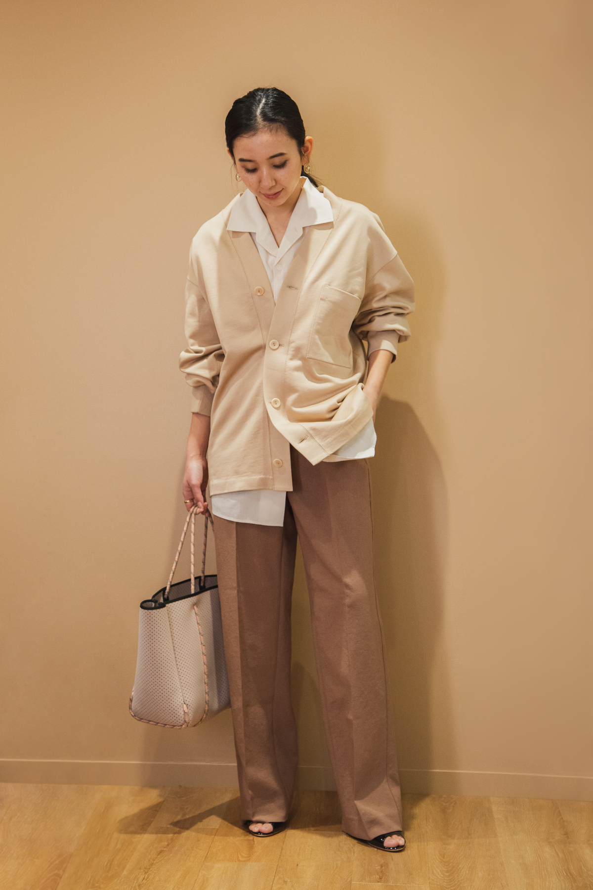「ナチュラルカラーのシャツ、ベージュのカーディガン、ピンク系ブラウンのパンツとグラデーションを作って、可愛くなりがちなピンクも配色で大人にアップデートしました。大きいサイズを着ただけのルーズな着こなしにならないように、襟を開けたり、ヒールを履いたりとテクニックを仕込みました」(近藤さん)