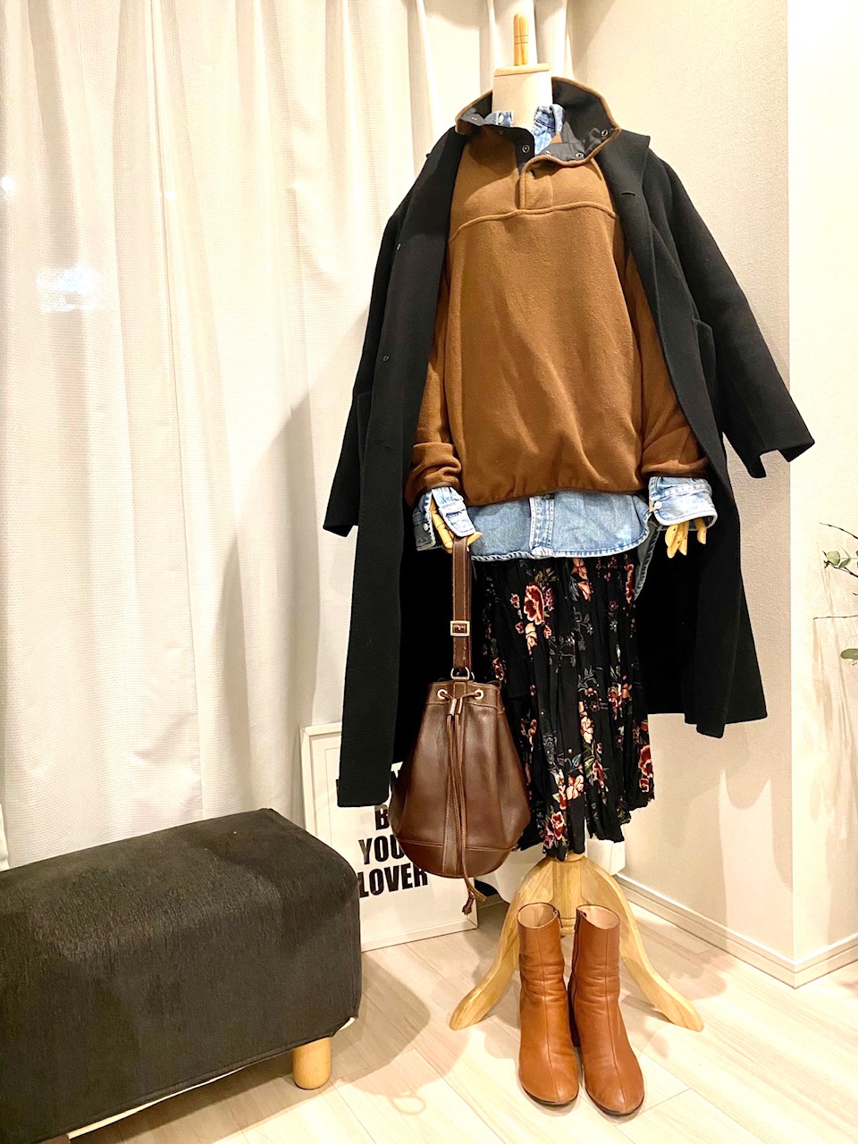 One Piecde→ZARA、Denim Shirt→RALPHLAUREN、Fleece Jacket →Shinzone、Coat→Shinzone、Bag→HERMES、Boots→Acne Studios