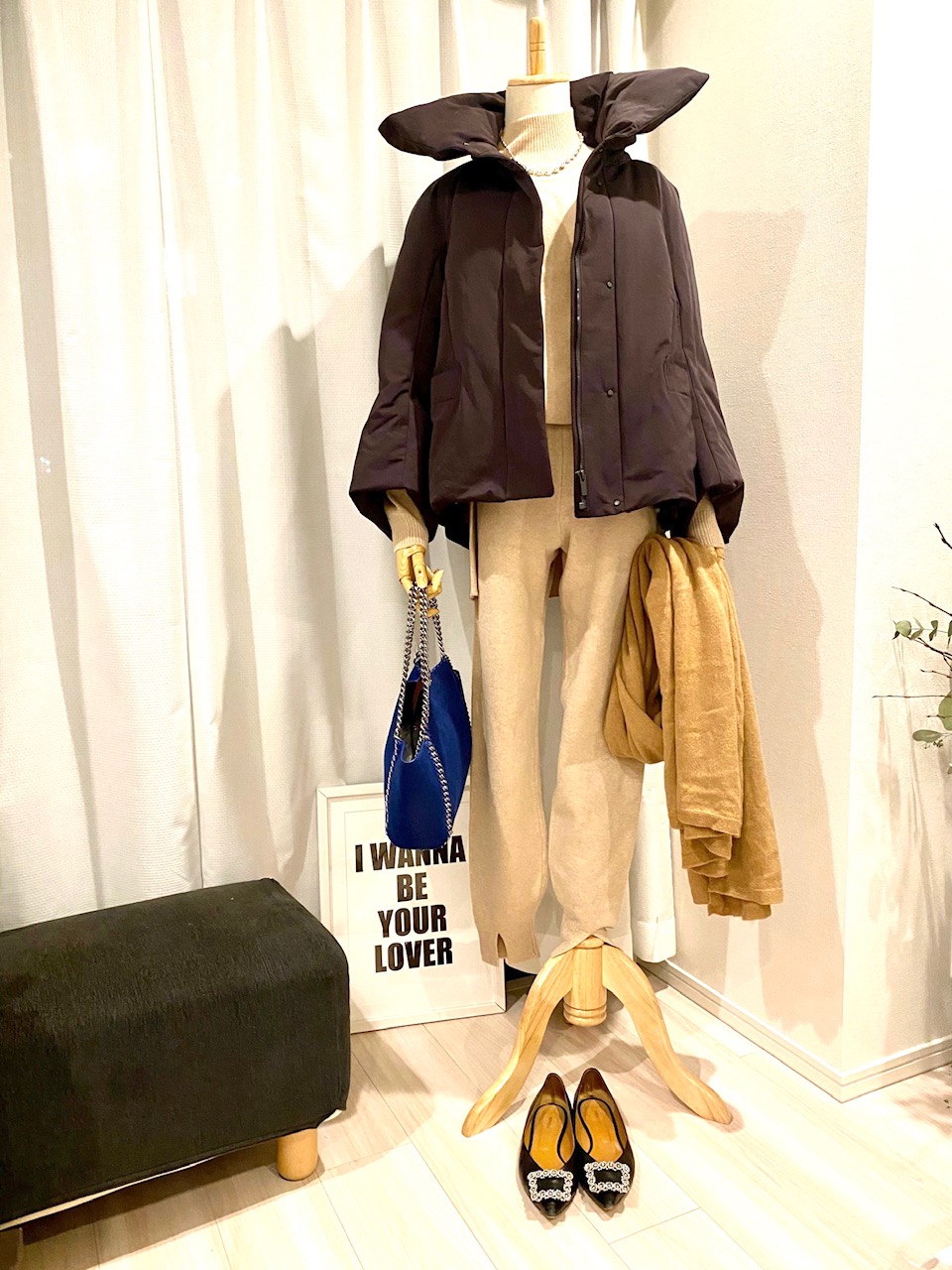 着太りしてしまう骨格タイプなので、いかに重ね着せずに防寒するかが勝負。きれいめデザインの“あったかアイテム”で、寒さ対策もスマートに。ハイゲージのニットセットアップとエレガントなダウンがおすすめです。