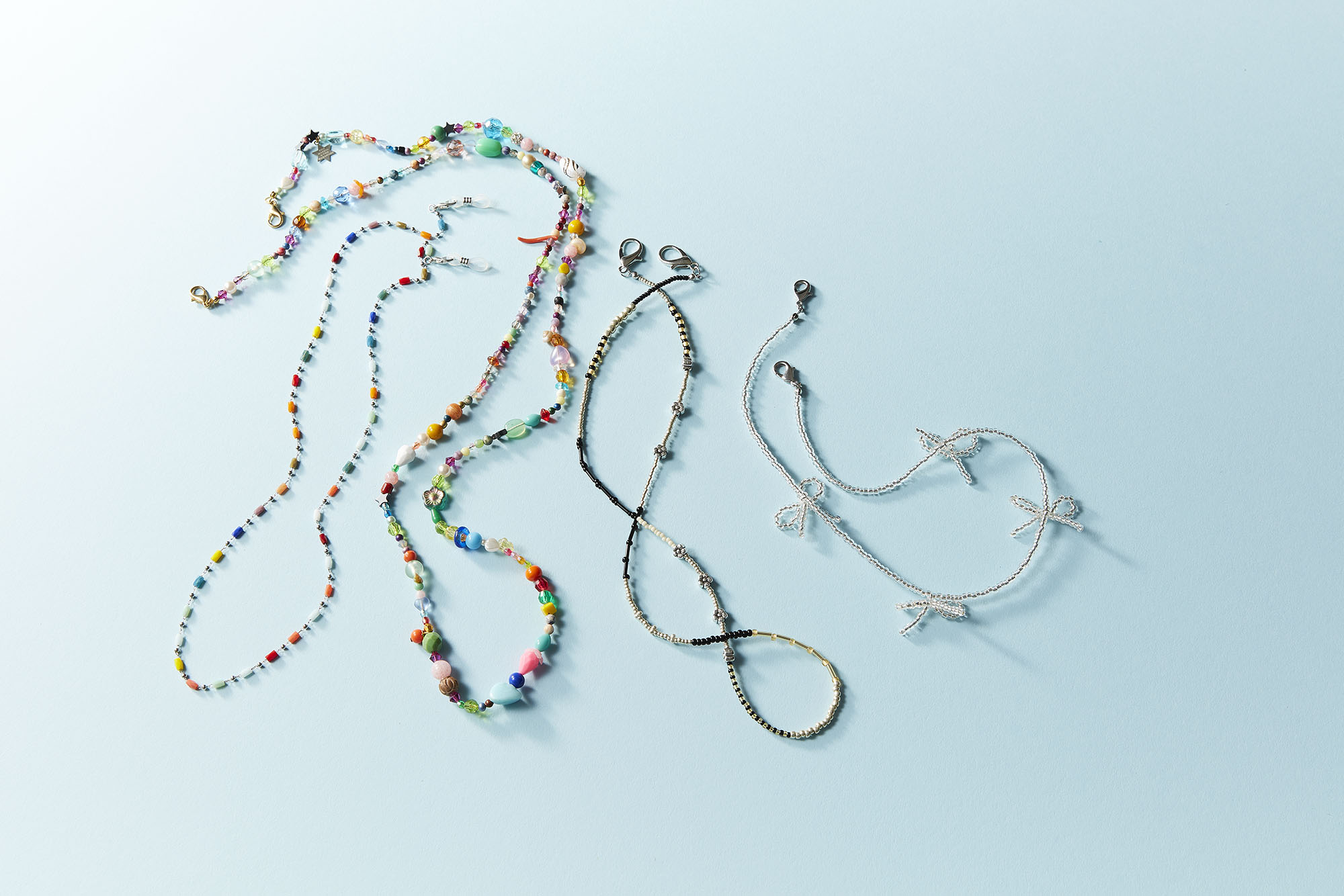 遊び心のあるビーズは、「ちょっと派手かも」と思うものの方がつけたときに可愛い。マスク生活を少しでも楽しく乗り切りましょう。右から/チェーン¥3,000(キャセリーニ)チェーン¥2,200(チムピ)チェーン¥29,000(ザ・マグパイ・アンド・ザ・ワードローブ/goldie H.P.FRANCE)チェーン¥2,800(BIBI/株式会社ジョリマリエ)