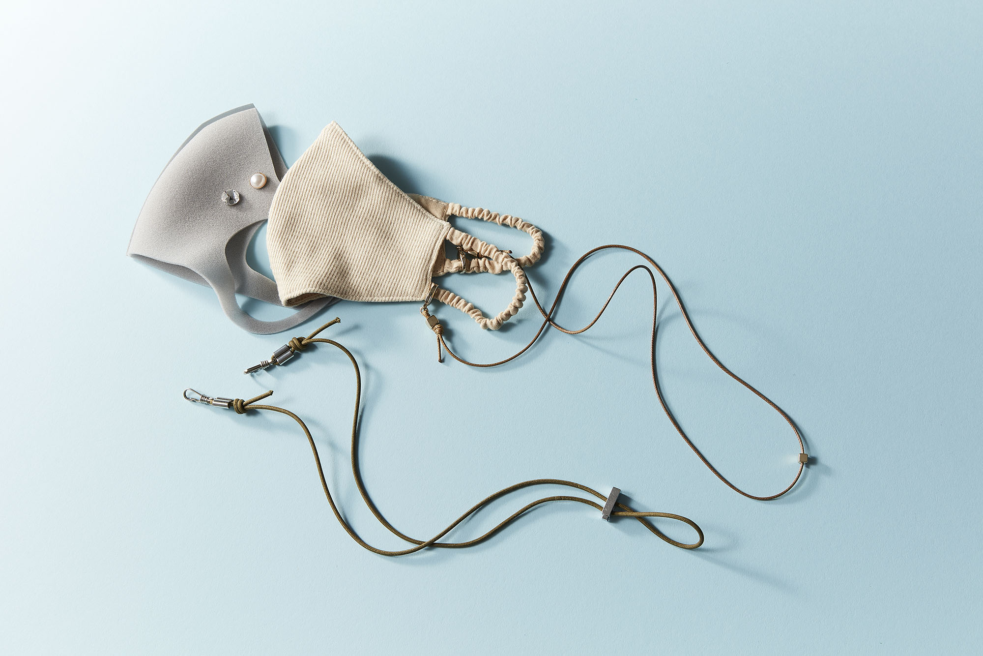 どんなシーンにも、どんなマスクにも馴染むシンプルコードタイプ。キラキラ度をUPさせるなら、マスクピアスとの合わせ技で。右から/チェーン付きマスク¥3,500(LAGUNAMOON/LAGUNAMOON ルミネ新宿)コード¥1,800(ミュラー オブ ヨシオクボ)グレーのマスクに付けたピアス¥1,800(BIBI/株式会社ジョリマリエ)
