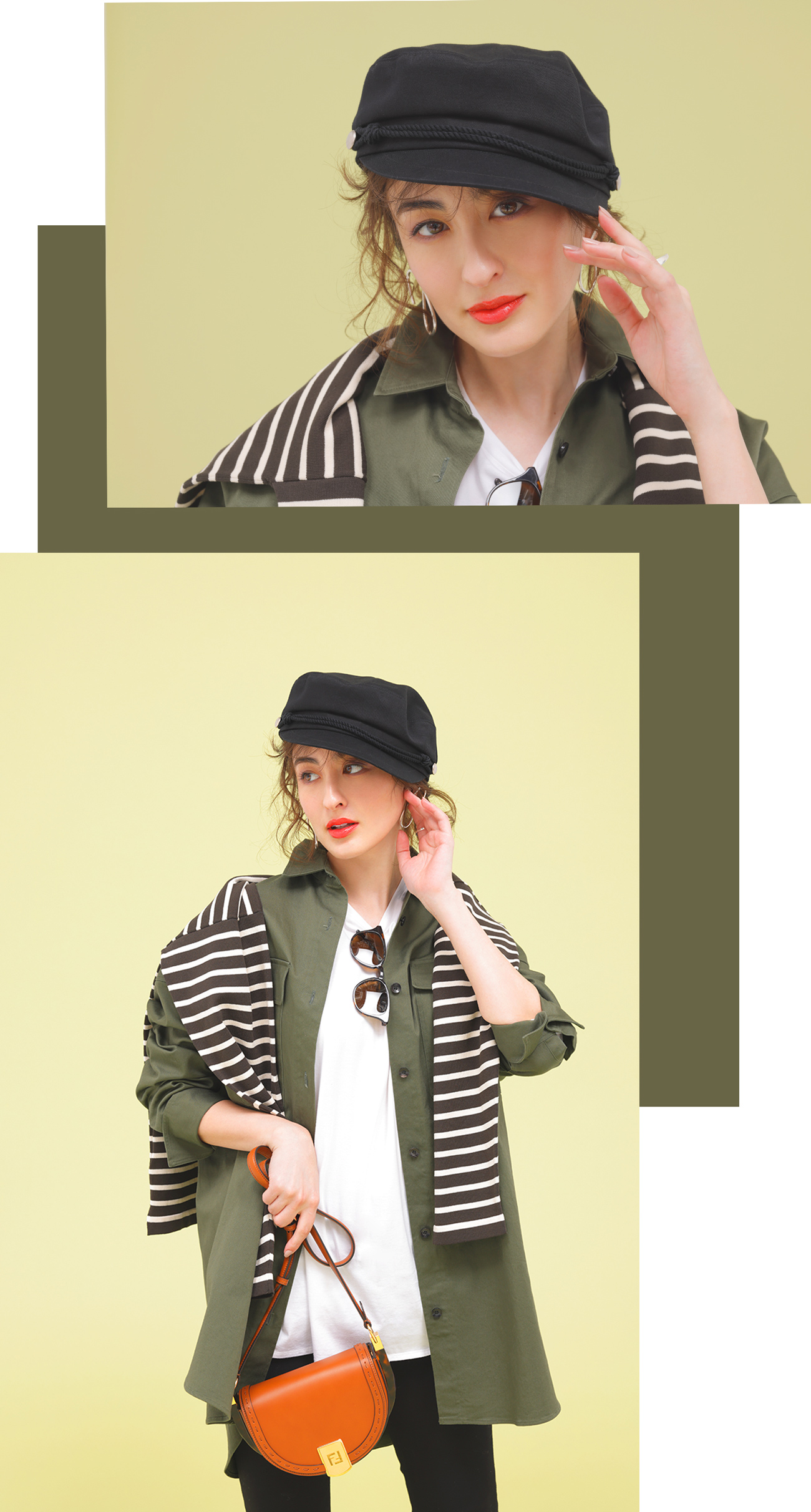 オーバーサイズシャツ¥23,000(COCUCA/ザ ストア バイシー 代官山店)ロンT¥16,000(サクラ/インターリブ)肩に巻いたボーダーニット¥28,000(アンデルセンアンデルセン/スティーブン アラン トーキョー)スキニーデニム¥19,000(ヤヌーク/カイタックインターナショナル)シューズ¥30,000(ジャラン スリウァヤ×デミルクス ビームス/デミルクス ビームス 新宿)帽子¥4,500(カオリノモリ/カオリノモリ ハラジュク)ピアス¥28,000 リング¥28,000(ともにブランイリス/エストネーション 六本木ヒルズ店)サングラス¥16,800(KOMONO/エイチエムエス アーカイブ ルミネエスト新宿店)ソックス(スタイリスト私物)