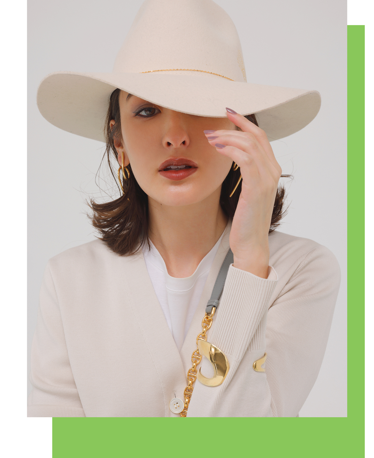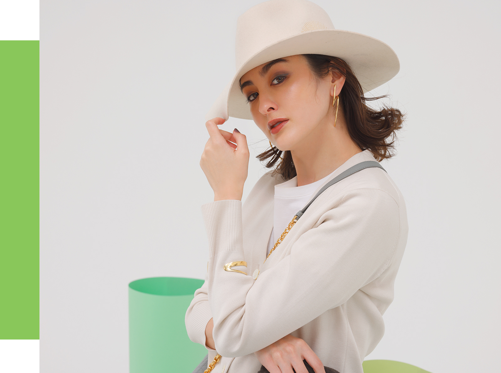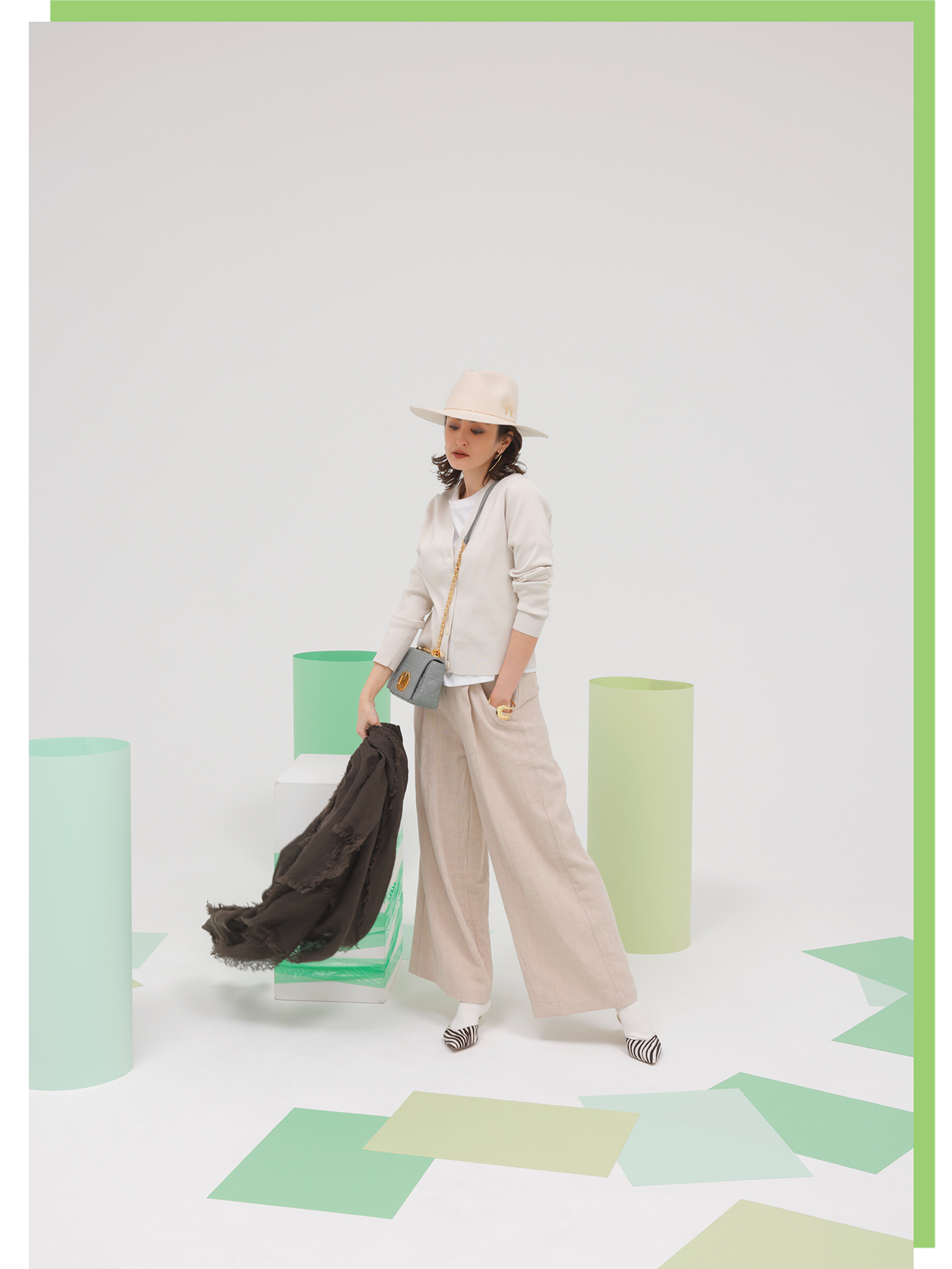 カーディガン¥32,000Tシャツ¥9,000(ともにebure/ebure GINZA SIX店)ワイドパンツ¥14,000(LAATO/アーバンリサーチ プレスルーム)ミュール¥26,000(2.718/ガリャルダガランテ 表参道店)帽子¥26,000(ヴァン パルマ/ドレスレイブ/ジオン商事)ピアス¥34,000バングル¥86,000(ともにブランイリス/エストネーション 六本木ヒルズ店)ストール¥25,000(アソース メレ/デミルクス ビームス 新宿)ソックス(スタイリスト私物)