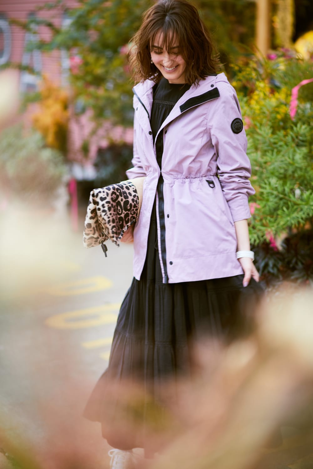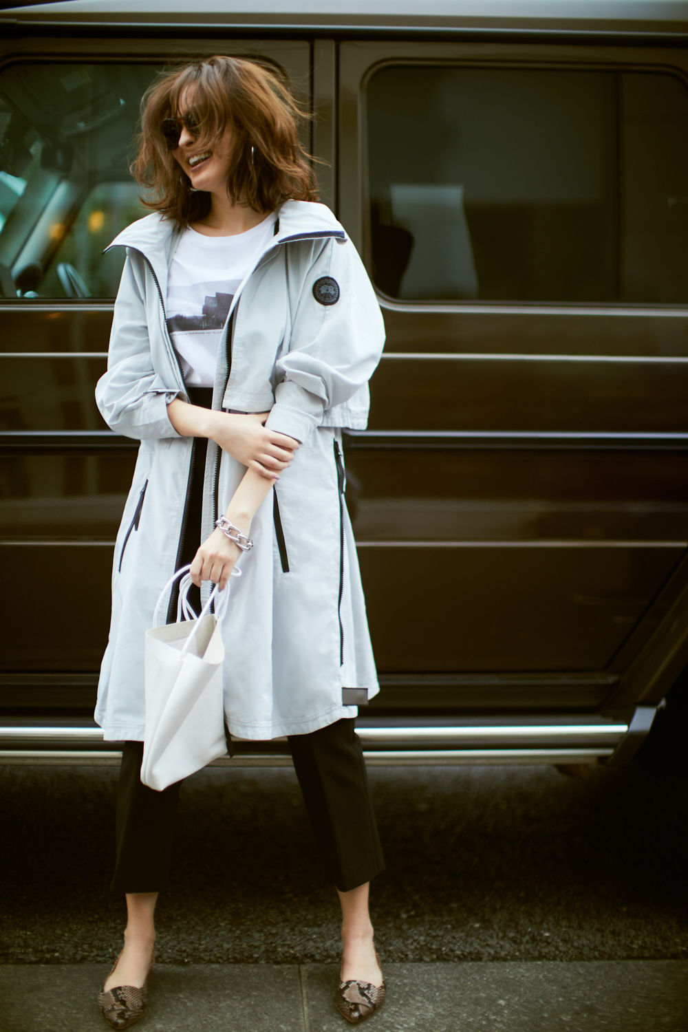スリムなAラインで女らしいシルエットに仕上げた軽量レインジャケット。防水性は完璧 ! ストレッチが効いているので、Gジャンの上に羽織ってもスムースに動けます。もちろん晴れた日だってOK。 ジャケット¥74,000(カナダグース)Gジャン¥33,000タンクトップ¥7,500(ともにハイク/ボウルズ)パンツ¥39,000(エイトン/エイトン青山)バッグ¥24,000(ステート オブ エスケープ/サザビーリーグ)シューズ¥51,000(ネブローニ/フラッパーズ)メガネ¥33,000(アイヴァン/アイヴァン PR)ピアス¥20,000<Folk/N>バングル¥52,500<NORTH WORKS>(ともにUTS PR)