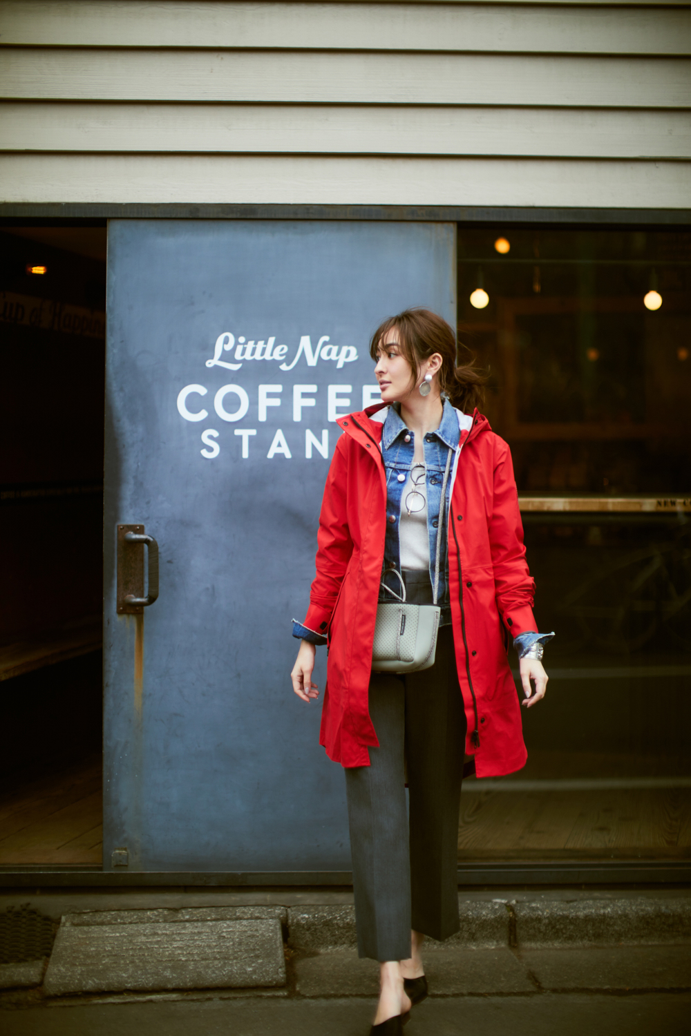 女らしく着られる真っ赤なアウターで雨空の下もヘルシー可愛く